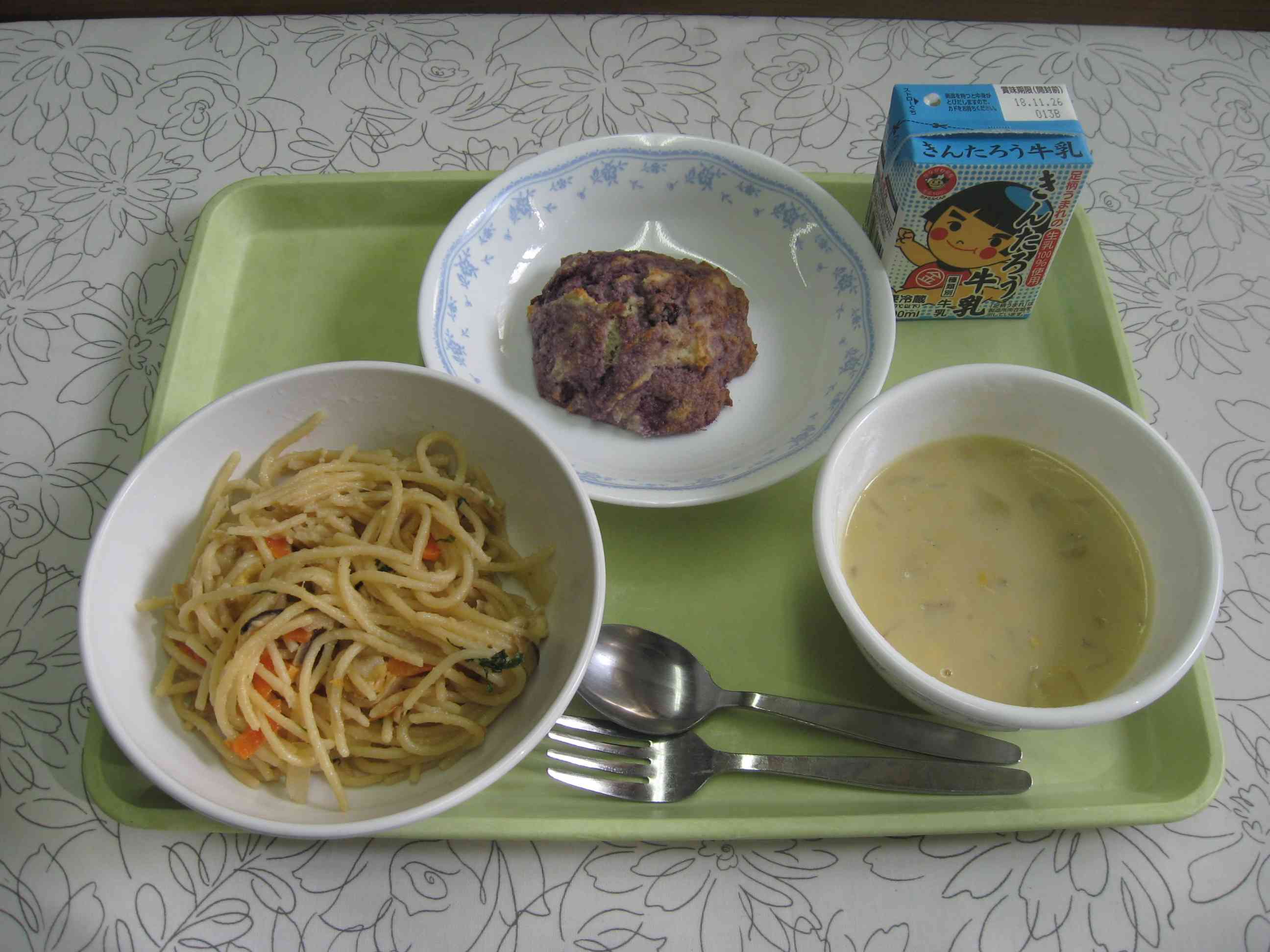 【今日のメニュー】 和風スパゲティ、コーンスープ、おからスコーン、牛乳 【栄養教諭から】 今日の和風スパゲティには、シソの葉を刻んで入れました。きのこ類もたくさん入っているので、香り豊かに仕上がりました。給食でシソの葉を使うことがあまりないので、子どもたちがどんな反応をするか、気になるところです。 また、今日のスコーンには、食物繊維豊富なおからがたっぷり入っています。ヨーグルトとブルーベリージャムも入れ、おから独特の香りは、ほとんど感じないように工夫してみました。【添付ファイル】