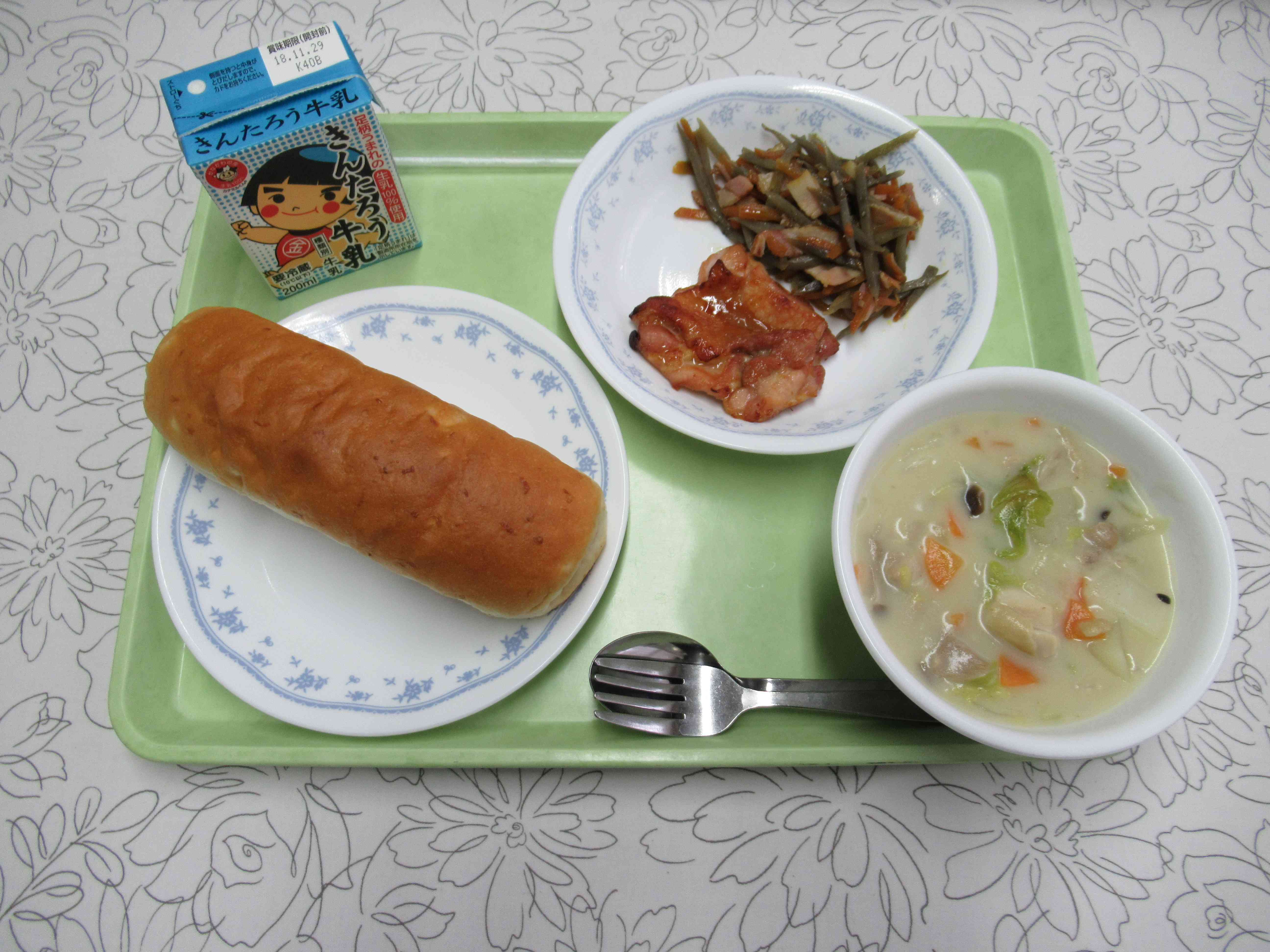 【今日のメニュー】 玄米パン・白菜のクリーム煮・鶏肉の照り焼き・洋風金平・牛乳 【栄養教諭から】 今日は洋食なのに金平?!と思われるかもしれませんが、洋食に合う味付けで作りました。ベーコンと白ワインを使うだけで、さっぱりとした仕上がりになります。パンやクリーム煮などやわらかいものが多いので、歯ごたえの残るように炒めました。