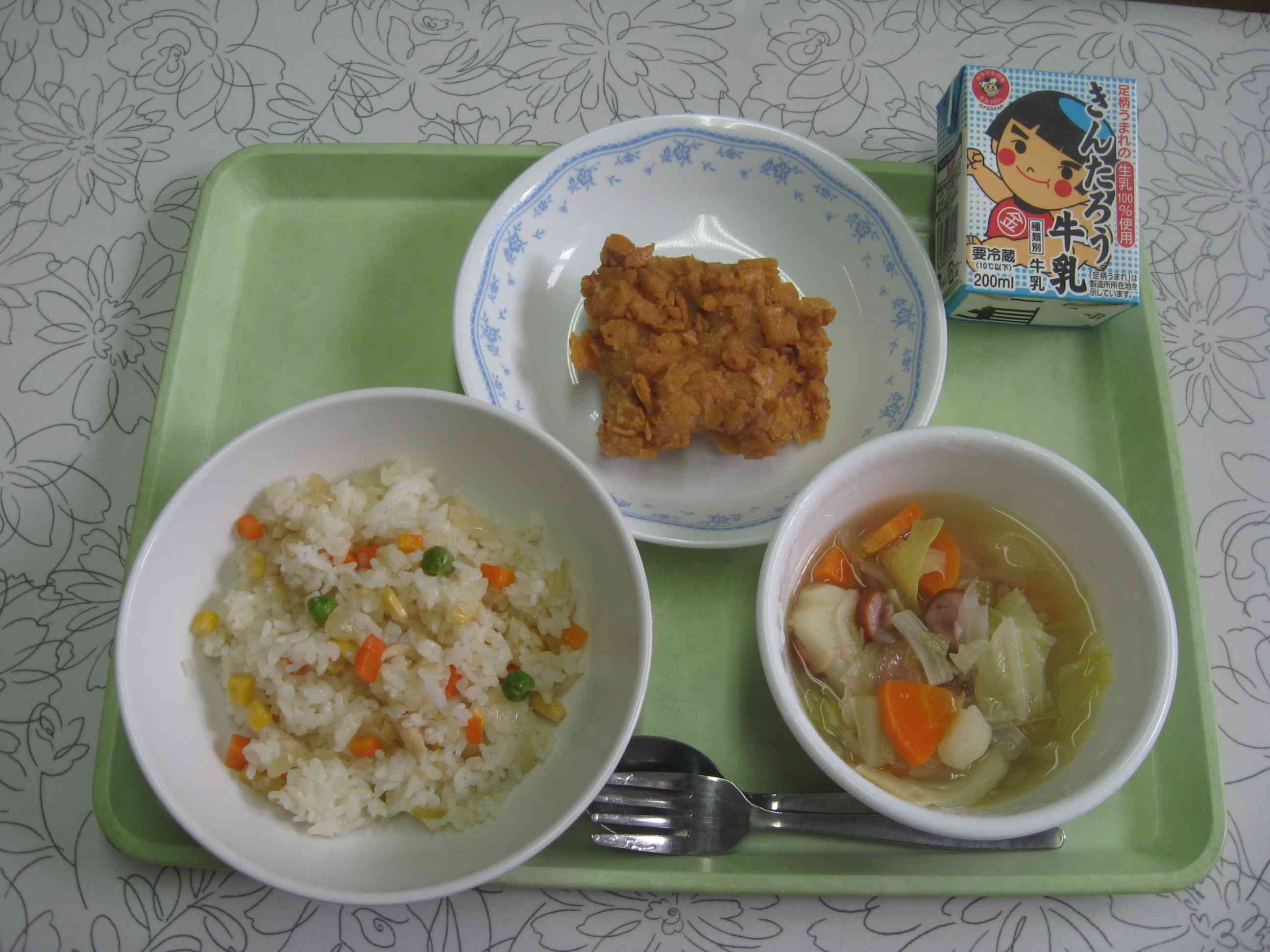 【今日のメニュー】 チキンピラフ、鶏肉のクラッカー揚げ、ポトフ、牛乳 【栄養教諭から】 今日は、鶏肉の衣に細かく砕いたクラッカーを使いました。ザクザクとした歯ごたえと程よい塩気があり、ソースをかけなくてもおいしく食べられます。 クラッカーを上手につけるポイントは「大きさ」です。1cm角程度の大きさになるように砕くと、揚げてもはがれにくく、ちょうどよい歯ごたえに仕上がります。ご家庭でもぜひ試してみてくださいね。【添付ファイル】