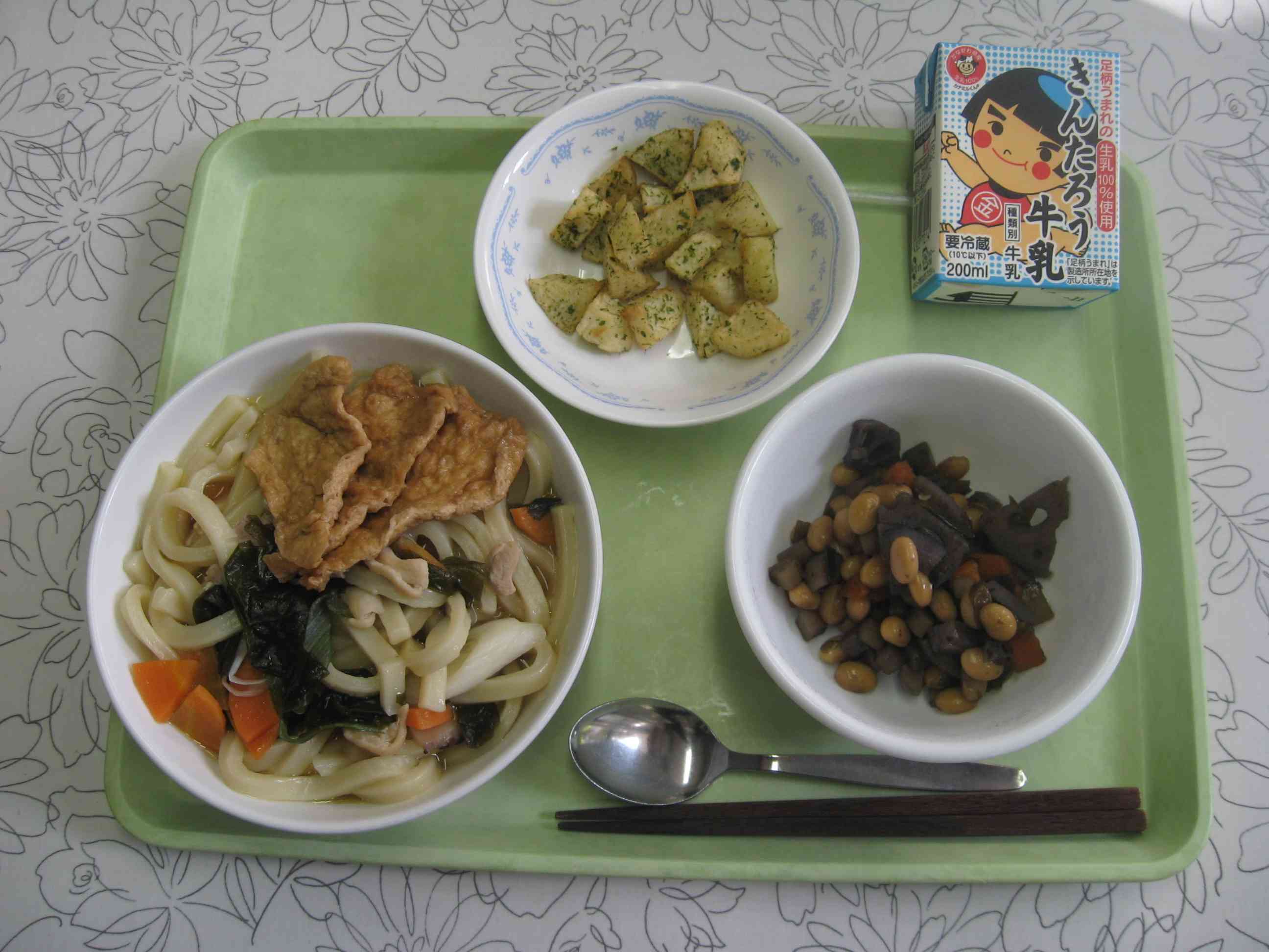 【今日のメニュー】 きつねうどん、五目豆、のり塩ポテト、牛乳 【栄養教諭から】 今日の「きつねうどん」の油揚げは、味が良くしみるように、うどんの汁とは別鍋で煮ました。 また、給食でよく登場する「五目豆」。湯本小の子どもたちは、大豆や野菜の献立はよく食べますが、五目豆の残りは少し多い傾向にあります。そこで、その原因を探るべく、今日は「食べにくさ」という観点からスプーンをつけてみました。これで、いつもより残りが少なければ、今後はお箸が上手に使えるようになる策を練ろうと思います。【添付ファイル】