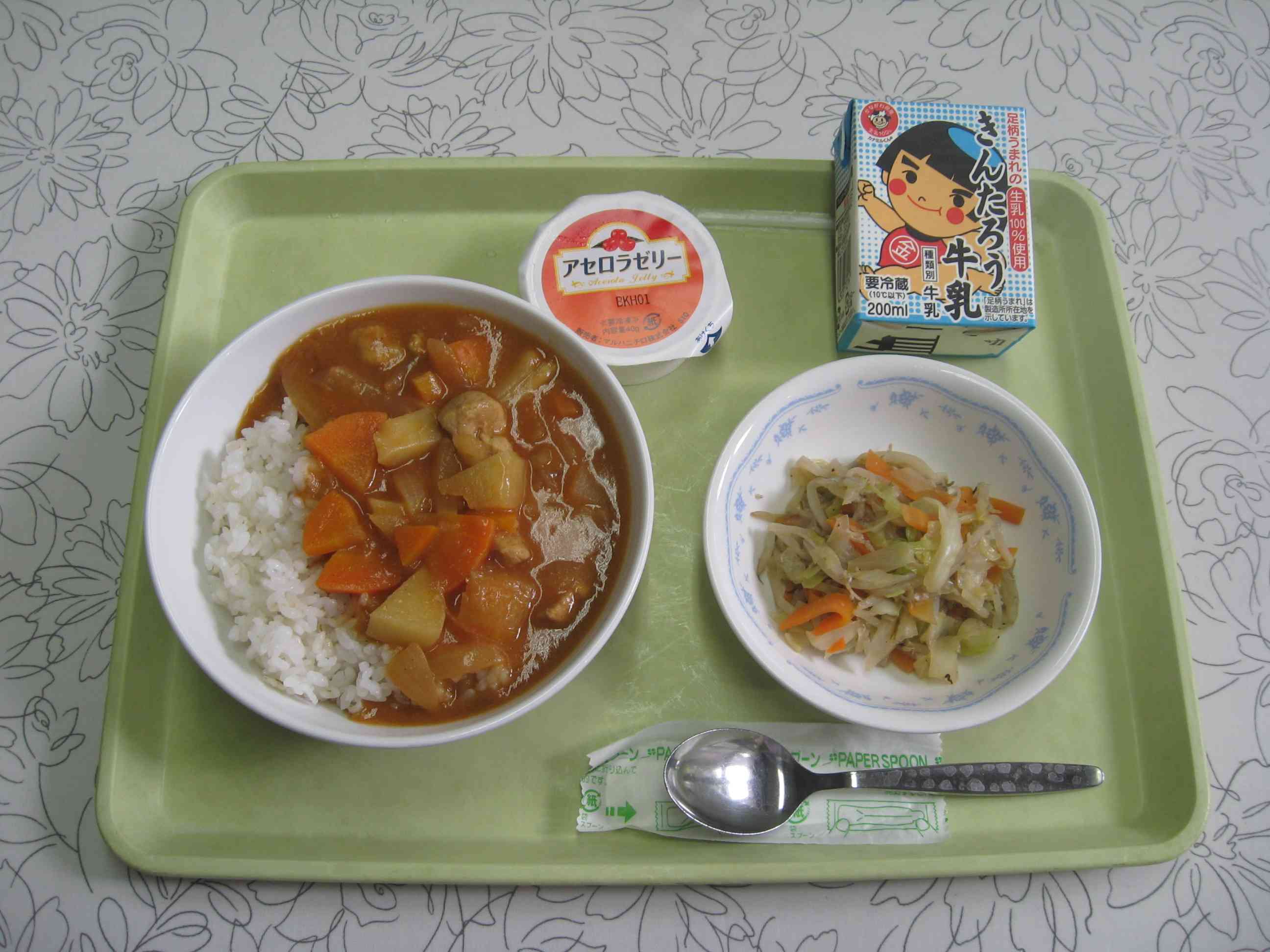 【今日のメニュー】 ポークカレー、じゃことキャベツの炒め物、アセロラゼリー、牛乳 【栄養教諭から】 今日は、小中一貫共通献立の日です。ポークカレーと牛乳が他の3校と共通の献立になっています。 湯本小のカレーのこだわりは、ルウから手作りしていることです。今日のポークカレーも、フルーツチャツネやリンゴ、はちみつ等で、甘さの中にもスパイシーさが残るように作りました。また、今日はごはんも増量して提供してみました。【添付ファイル】