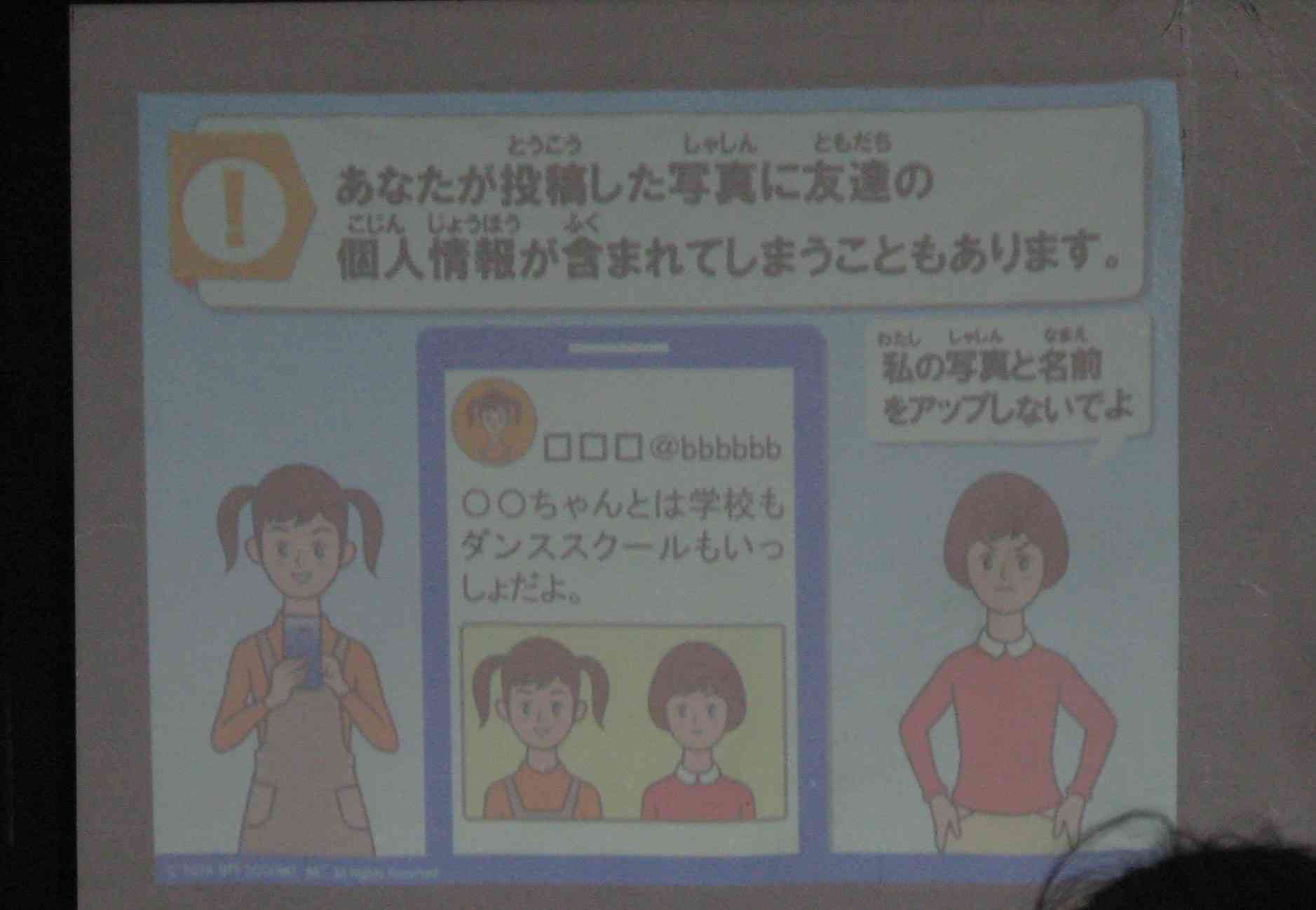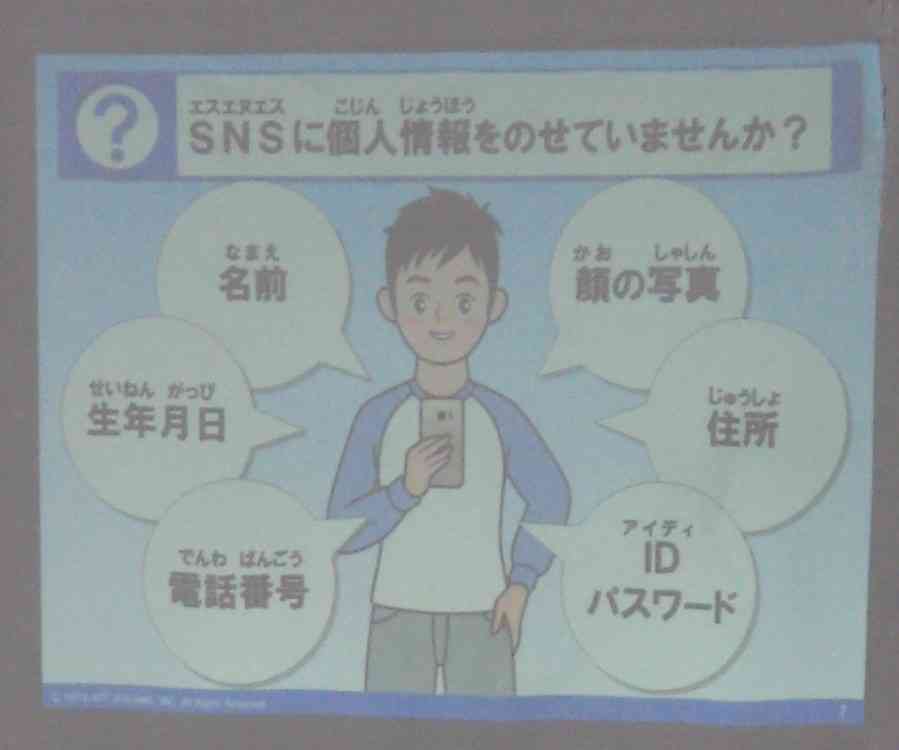本日、5校時、高学年の児童を対象に「携帯電話安全教室」を実施しました。NTTドコモの講師の方から教えていただいたのは主に次の内容です。 1 スマートフォン、インターネットの利用について 2 個人情報の取り扱いと危険性 3 SNSなどの文字でのやり取りの危険性と難しさ SNSに関係する事件に、小学生が巻き込まれている場合も増えてきているそうです。 これからの時代、インターネットやスマートフォン等がさらに普及していくことでしょう。これらの危険性も理解したうえで、上手に使いこなしてほしいと願います。 参観くださった保護者の皆様、ありがとうございました。【添付ファイル】