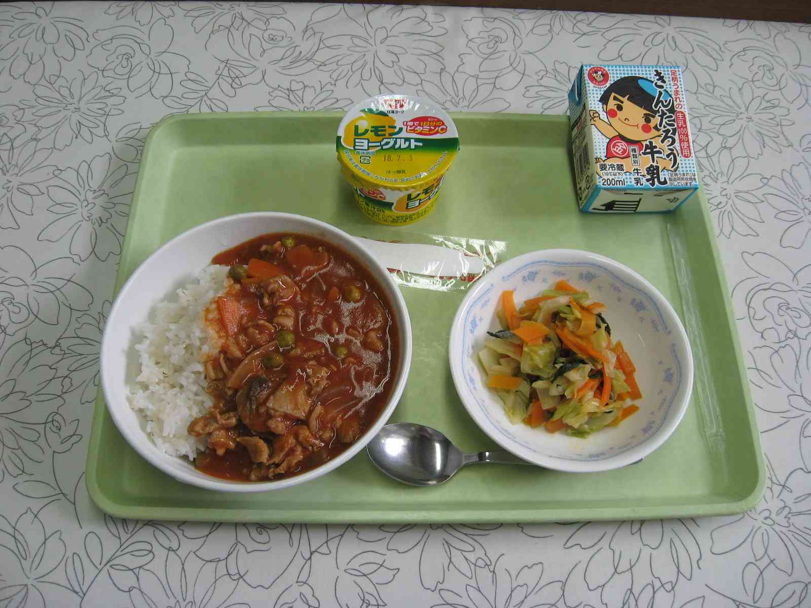 【今日のメニュー】 ハヤシライス、キャベツと青菜の炒め物、レモンヨーグルト、牛乳 【栄養教諭から】 今日は、子どもたちの大好きなハヤシライスです。給食室ではルウから作っています。小田原産の玉ネギをたっぷり入れて、おいしく仕上げました。 今日も完食まちがいなし!の献立です。