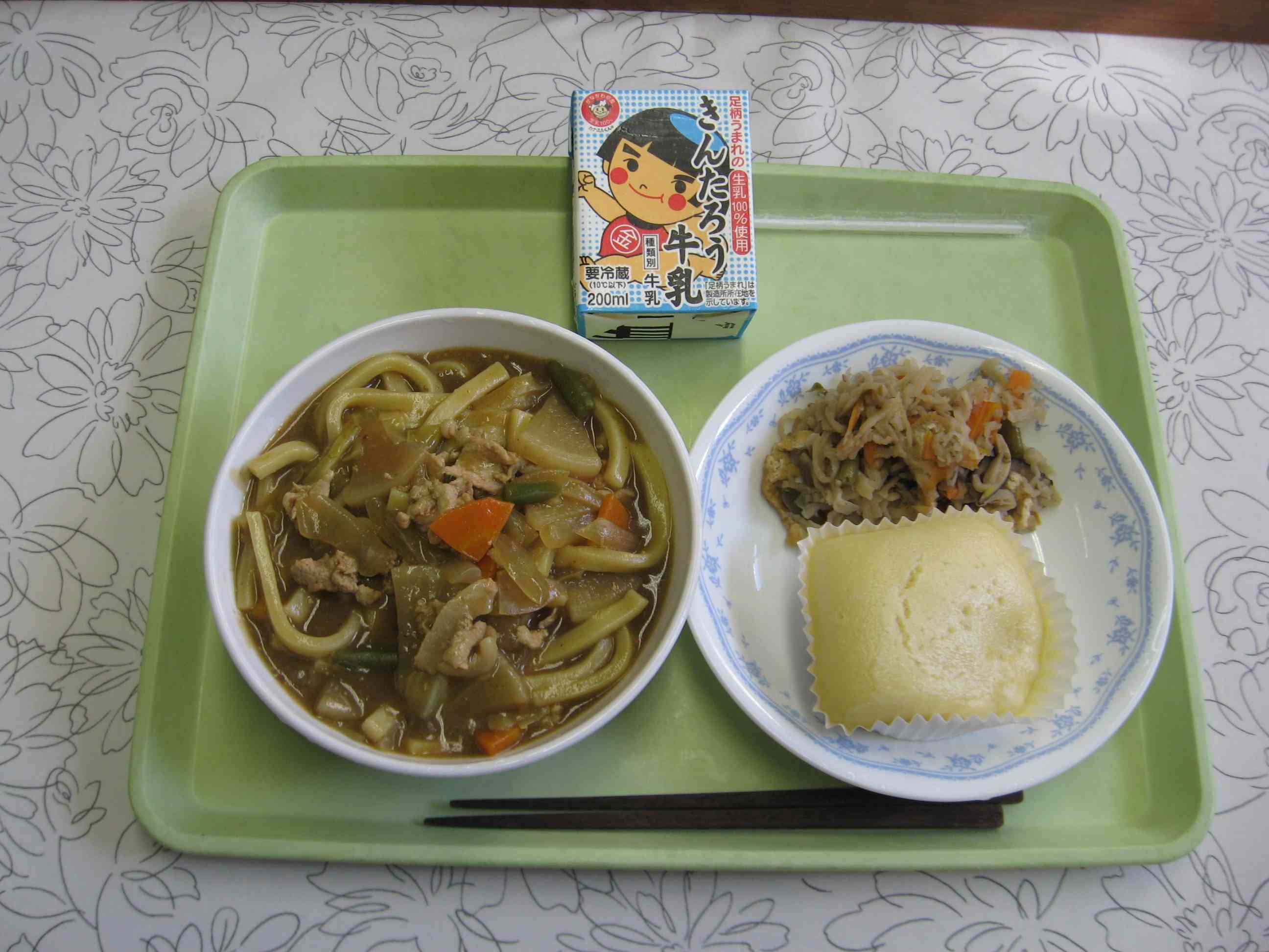 【今日のメニュー】 カレーうどん、手作り肉まん、切り干し大根の煮物、牛乳 【栄養教諭から】 今日は、手作り肉まんです。生地は、ホットケーキミックスにヨーグルトを混ぜて作ってあります。包むのは大変なので、カップに具を入れ、上から生地を流し入れて蒸します。具の中には、人参やタケノコ等、野菜もたくさん入っています。