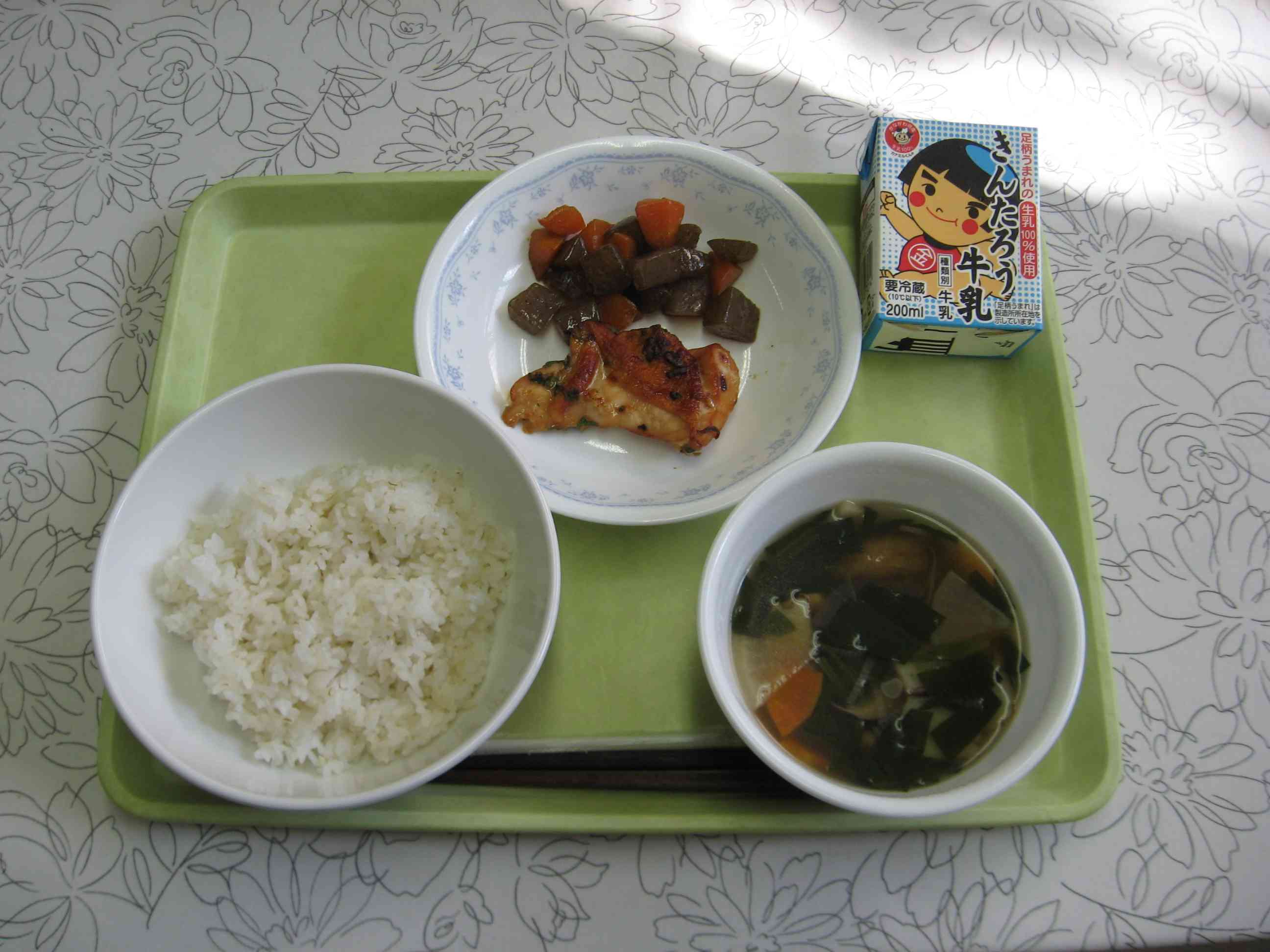 【今日のメニュー】 麦ごはん、たぬき汁、鶏肉の香味焼き、こんにゃくのピリ辛煮、牛乳 【栄養教諭から】 今日のお汁は「たぬき汁」です。精進料理のひとつであるたぬき汁は、お肉の代わりにこんにゃくを入れるのが特徴だそうです。 鶏肉の香味焼きには、香味野菜のにんにく、しょうが、葉ねぎとタマネギを入れてつけこみました。