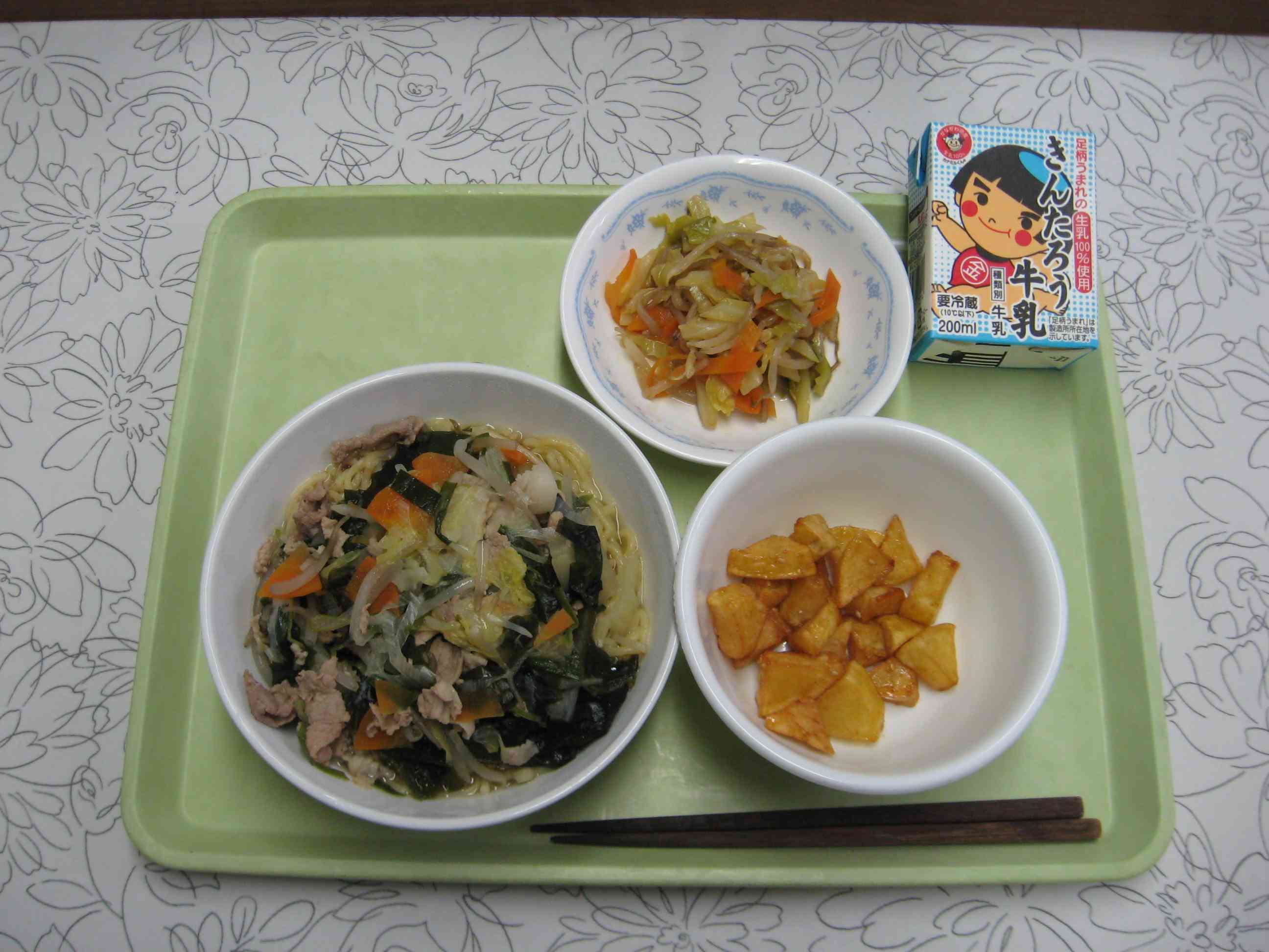 【今日のメニュー】 タンメン、野菜のオイスター炒め、ポテトの胡麻ダレ、牛乳 【栄養教諭から】 ラーメンは、今年も湯本小学校で給食人気ランキング1位となった献立です。 今日は、様々な野菜をたっぷり煮込んだ「タンメン」にしました。 ポテトの胡麻ダレは、揚げたジャガイモに、すった胡麻をたくさん入れたタレを絡めて作りました。