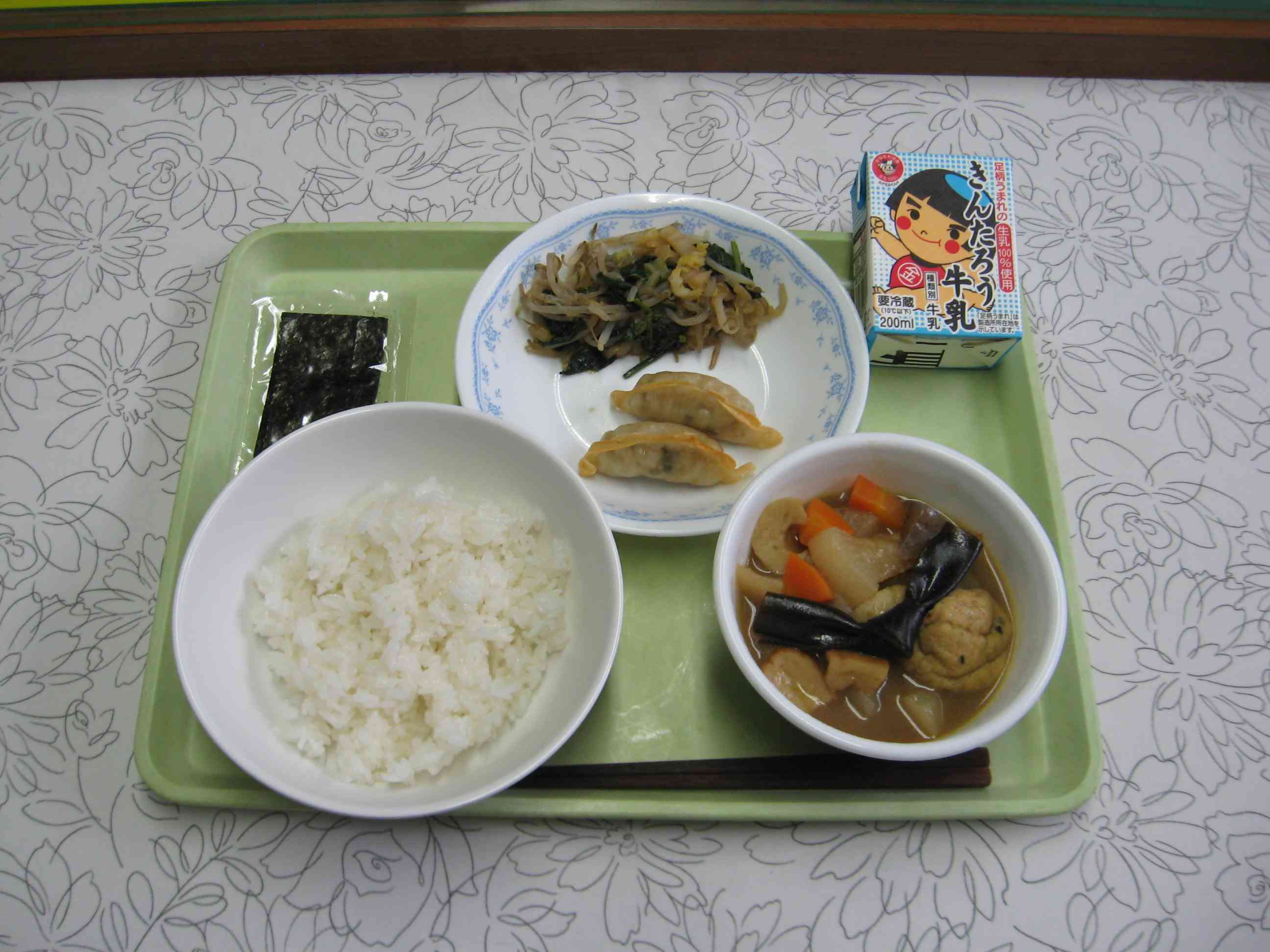 【今日のメニュー】 ごはん、焼きのり、カレーおでん、おさかなくん餃子、煮びたし、牛乳 【栄養教諭から】 今日は、小中一貫教育共通献立と神奈川県産給食デーです。 お米、焼きのり、牛乳、お魚くん餃子、竹輪、さつま揚げ、がんもどきが、神奈川県産です。いつもは麦ごはんですが、今日は「神奈川」をしっかり味わってもらおうと思い、「白飯」にしました。 箱根は農作物の収穫がほとんどないため、箱根西麓の野菜を多く使います。産地は静岡県ですが、近くのものを使うという点では、地産地消となっています。【添付ファイル】