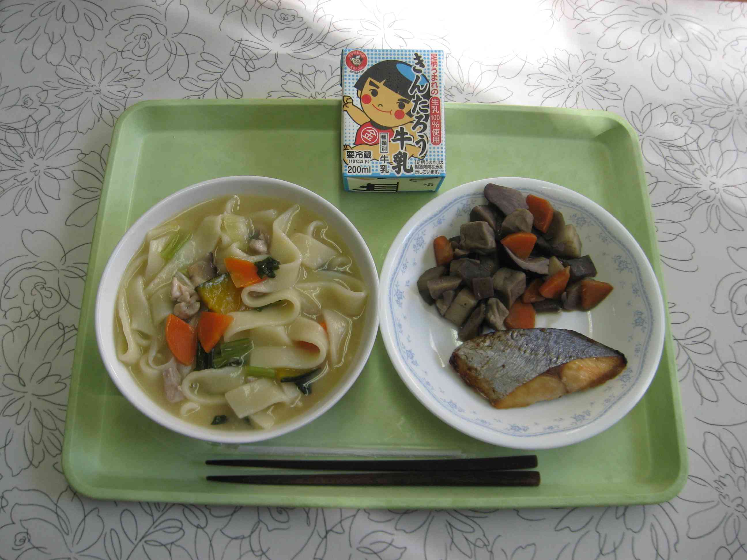 【今日のメニュー】 ほうとう、さわらの幽庵焼き、野菜の煮物、牛乳 【栄養教諭から】 今日は少し早い「冬至献立」です。 冬至には運が良くなるように「ん」のつく食べ物を7つ食べると良い、とされています。にんじん、なんきん、れんこん、キンカン、ぎんなん、かんてん、饂飩(うどん)です。今日は、人参、南瓜、饂飩を使って「ほうとう」にしました。 また、ゆず湯につかう「ゆず」を使って、さわらは「幽庵焼き」にしました。【添付ファイル】