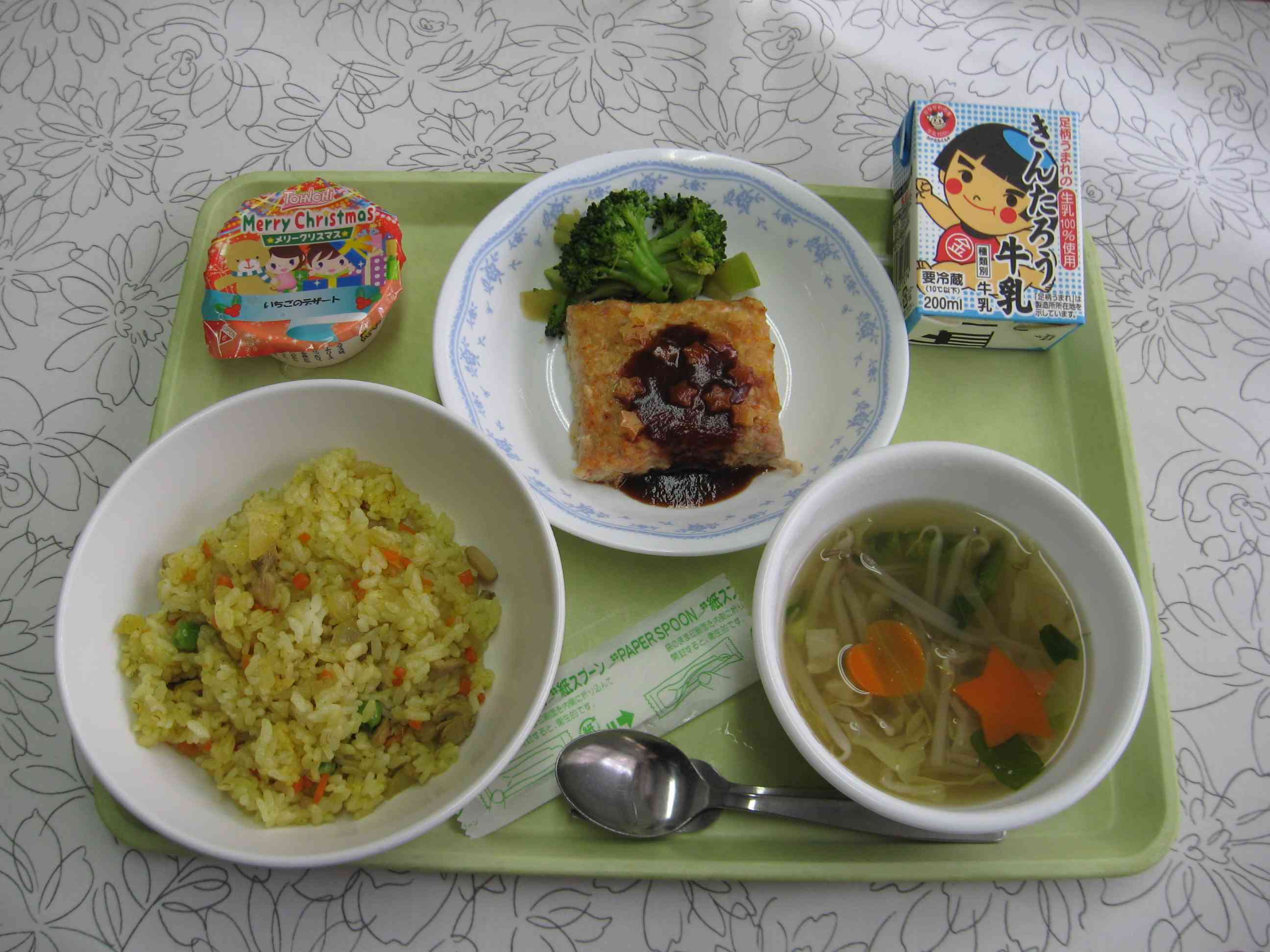 【今日のメニュー】 カレーピラフ、コンソメスープ、チーズハンバーグ、ボイルブロッコリー、イチゴのゼリー、牛乳 【栄養教諭から】 今日は、冬休み前最後の給食です。そこで、少し早いクリスマスメニューにしました。 メインのハンバーグには星型のチーズをのせ、スープにはハート型と星型に型抜きした人参を入れました。 今日のメニューは内緒だったので、献立表にも「お楽しみ」になっていました。子どもたちは材料からどんな献立なのかをずっと考えてくれていたので、実際の給食を見て喜んでくれるとうれしいです。【添付ファイル】