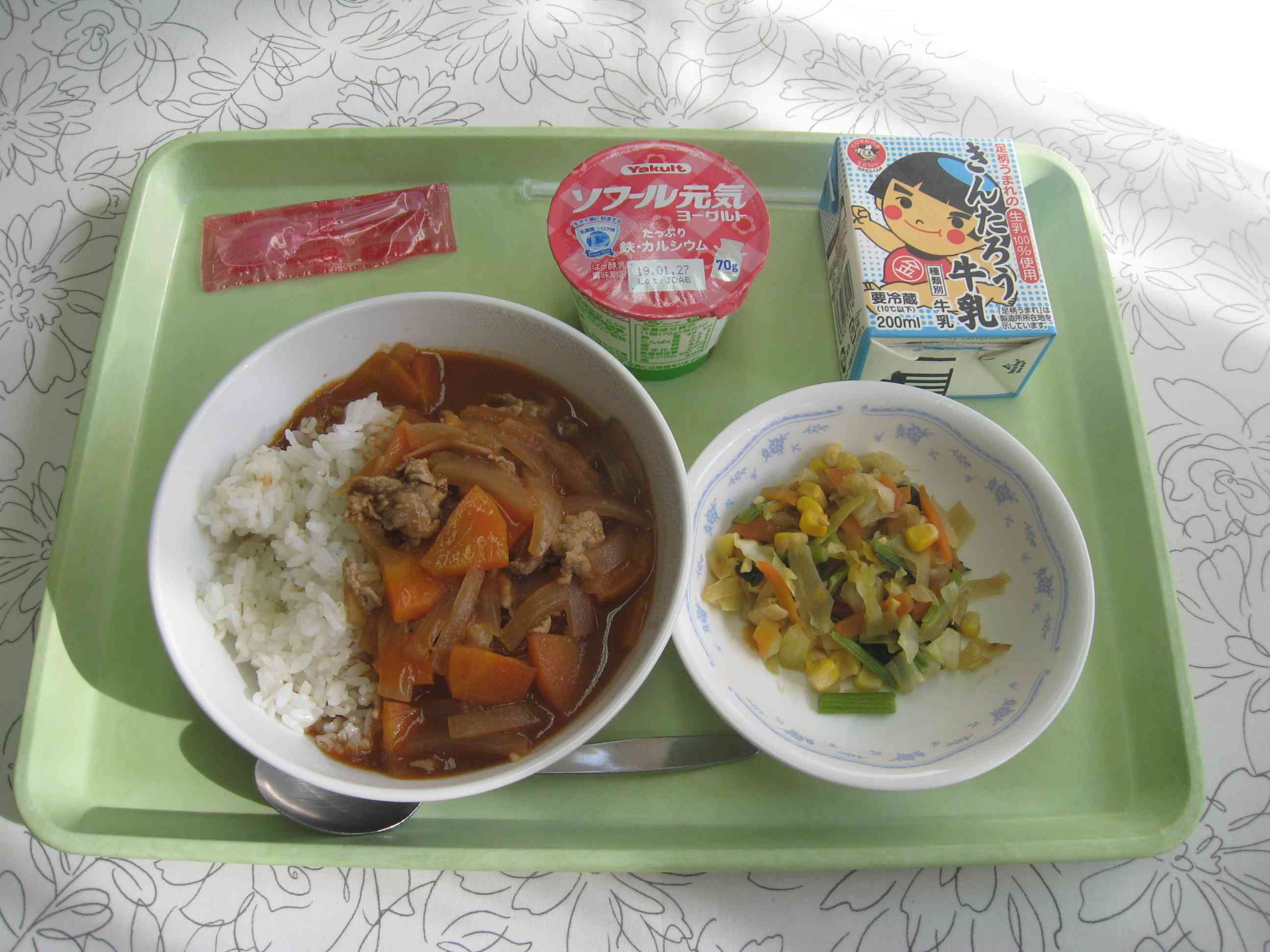 【今日のメニュー】 ハヤシライス、カラフルソテー、元気ヨーグルト、牛乳 【栄養教諭から】 今日は小中一貫教育共通献立です。 ハヤシライスは、ハッシュドビーフをもとに日本で変化した洋食です。給食ではビーフ(牛肉)ではなくポーク(豚肉)を使います。よく炒めて作ったブラウンルウとデミグラスソースで、コクのある味に仕上がりました。
