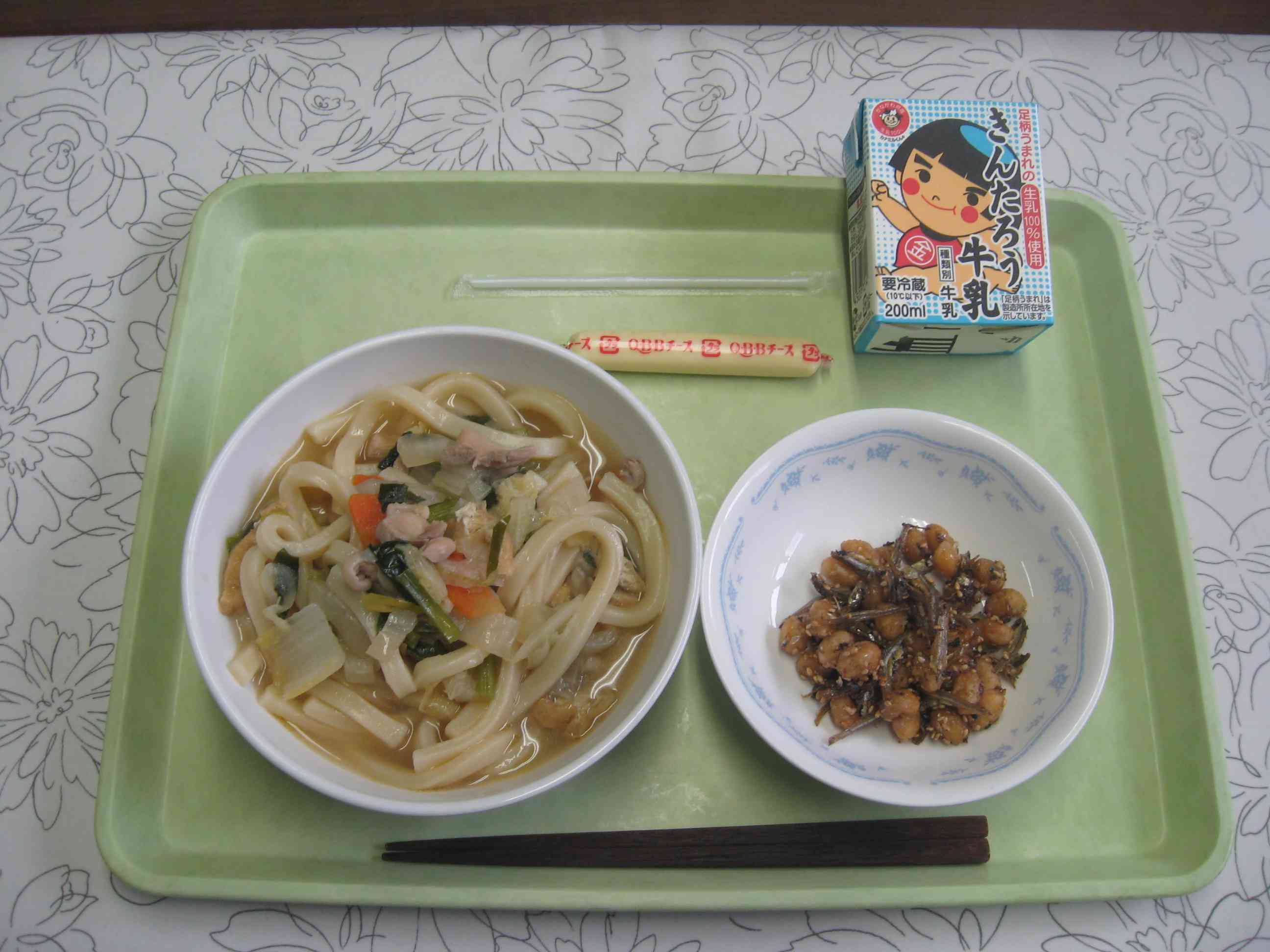 【今日のメニュー】 煮込みうどん、大豆と小魚の揚げ煮、チーズ、牛乳 【栄養教諭から】 今日の給食は、カルシウムがたくさん含まれる献立になっています。カルシウムが多く含まれる食品には、乳製品、小魚、大豆製品等があります。一般的に骨密度を高められるのは、二十歳までと言われています。成長期の今、そしてこれからのために、子どもたちにはしっかり摂ってほしい栄養素です。