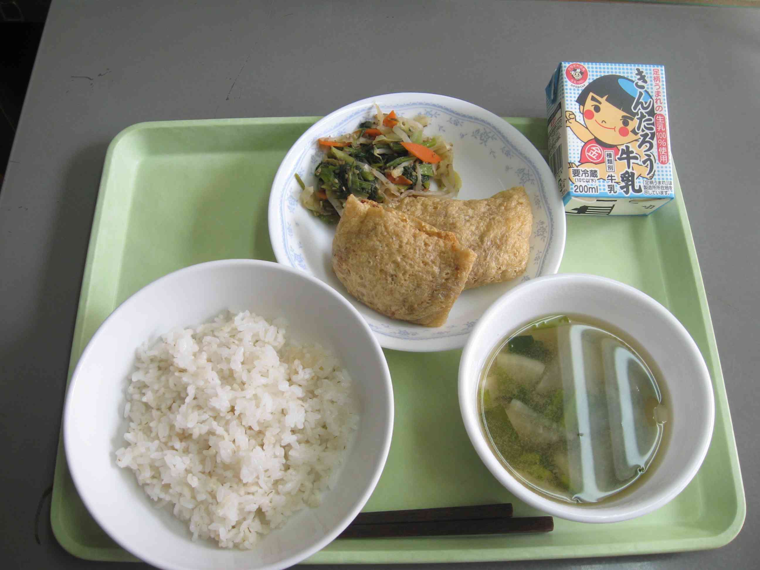 【今日のメニュー】 麦ごはん、大根のみそ汁、油揚げの春巻き、野菜の胡麻じょうゆ和え、牛乳 【栄養教諭から】 今日は、油揚げを皮にした春巻きです。半分に切った油揚げの中に具を詰めて、オーブンで焼きます。春巻きのように包む手間が省けるうえに、焼くと油揚げがサクッとして、簡単で美味しく作れます。油揚げは、油抜きをせずに使うのがサクサクにするコツです。