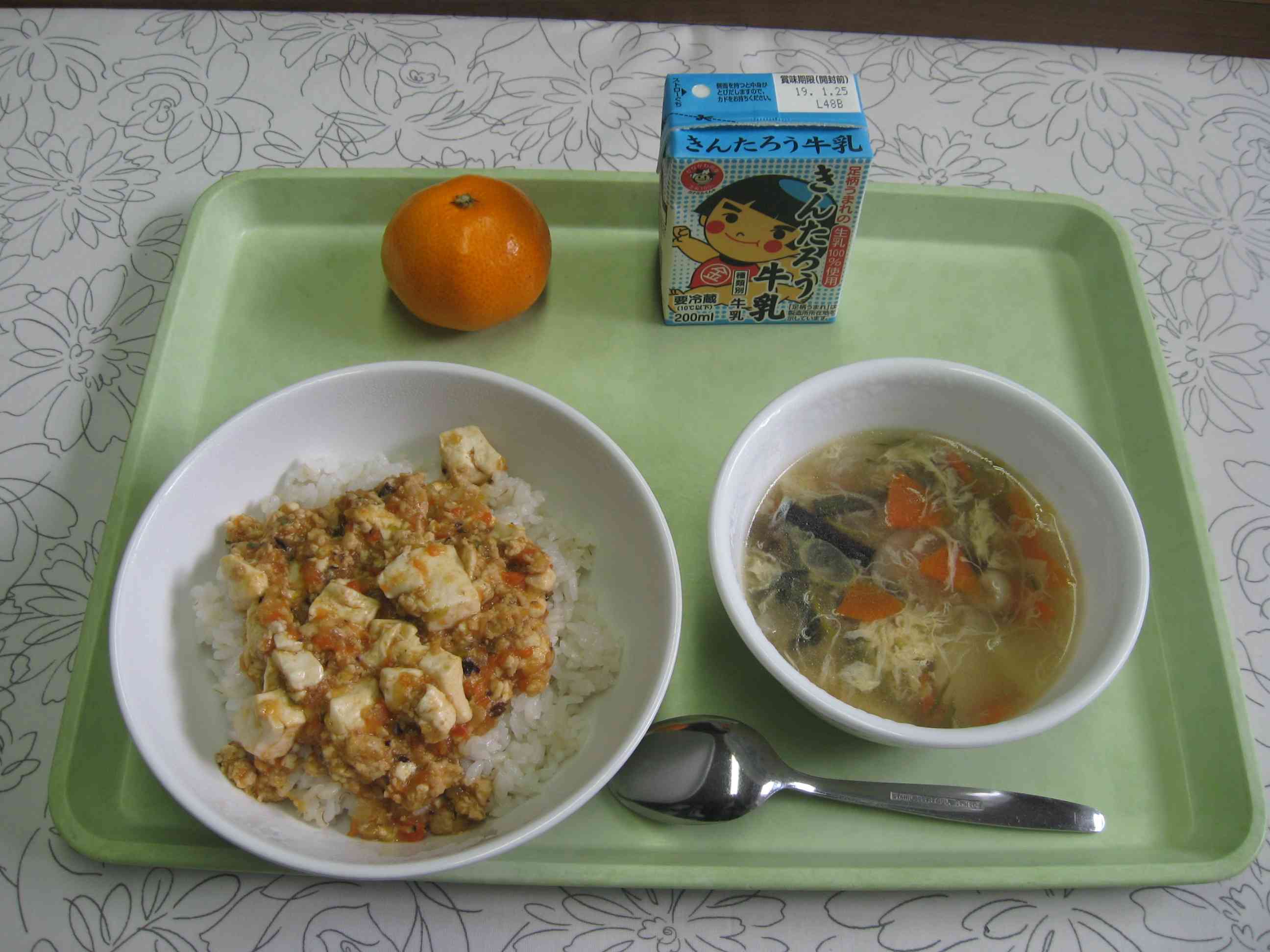 【今日のメニュー】 マーボー丼、ガタタン、みかん、牛乳 【栄養教諭から】 今日は、小中一貫教育共通献立で「ガタタン」という中華風スープです。これは、北海道芦別市の郷土料理で、姉妹都市の洞爺湖町の給食に出されているレシピを教えていただいたものです。 ガタタンには、たくさんの野菜とすいとんが入っていて、卵とじにします。とろみもついているので、冬にぴったりの料理です。【添付ファイル】