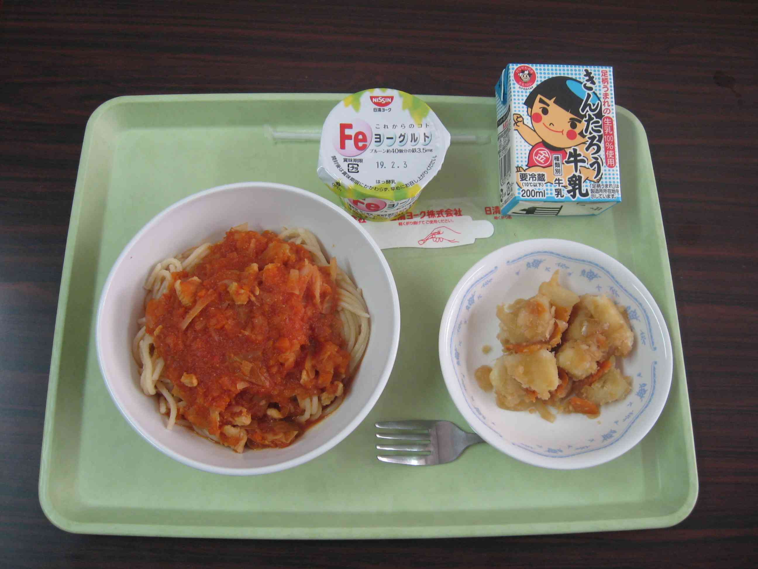 【今日のメニュー】 スパゲティトマトソース、かわりこふき芋、Feヨーグルト、牛乳 【栄養教諭から】 今日はトマトソースのスパゲティです。ケチャップは入れずに、ホールトマトとトマトピューレを煮込んで作ります。トマトは加熱すると旨味(うまみ)が出ます。じっくり煮詰めて、甘味と旨味を引き出します。