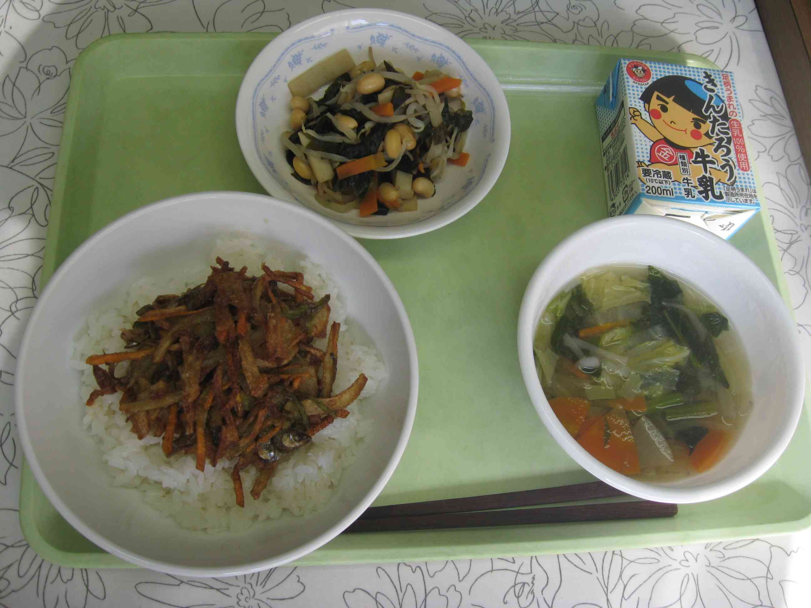 【今日のメニュー】 スクール箱根丼、みそ汁、大豆とわかめのナムル、牛乳 【栄養教諭から】 今日は、小中一貫教育共通献立、そして地産地消の献立の日です。 スクール箱根丼は、芦ノ湖でとれたワカサギをかき揚げにしています。今日は、ワカサギのほかに、お米、みそ汁の大根、ナムルのもやし、わかめが、神奈川県産の食材になっています。