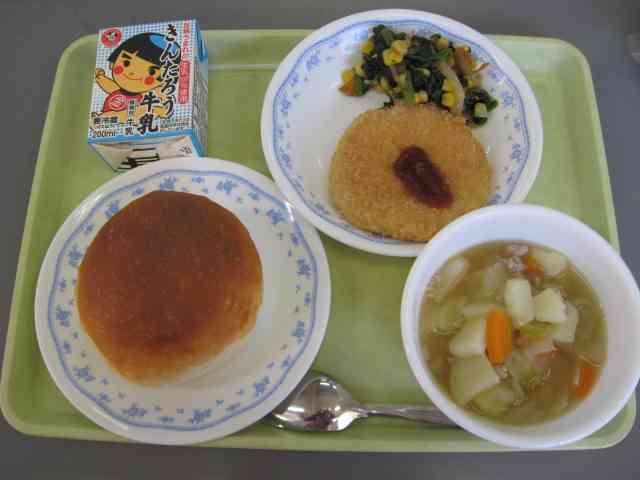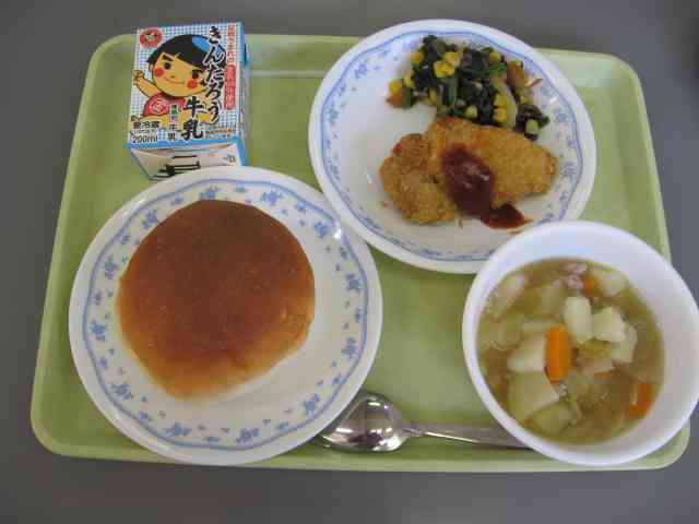 【今日のメニュー】 まるパン、ポトフ、ハムカツorチキンカツ、ほうれんそうのソテー、牛乳 【栄養教諭から】 1月24日~30日は全国給食週間です。戦後、様々な人によって給食を再開できたことに感謝する週間となっています。この一週間はセレクト給食やリクエスト給食等、献立も工夫してあります。今日は主食のセレクトでハムカツまたはチキンカツです。子ども達はダブルスコアでチキンカツが人気でした。