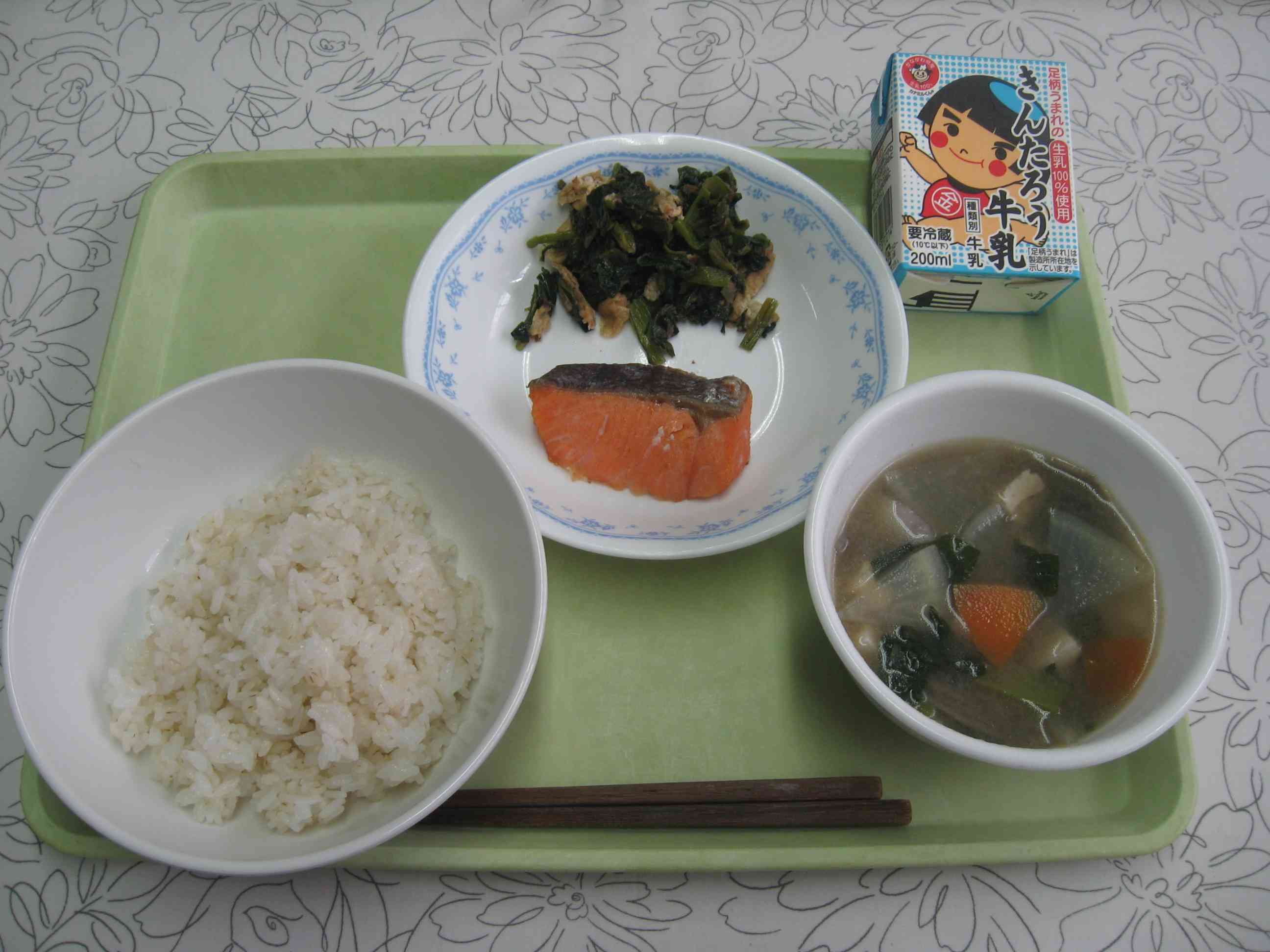 【今日のメニュー】 麦ごはん、みそけんちん、鮭の塩焼き、小松菜の煮びたし、牛乳 【栄養教諭から】 学校給食は、明治22年に山形県のお寺で始まりました。最初に出された給食は、「塩むすび、鮭の塩焼き、青菜のお浸し」でした。 今日は、そんな最初の給食にちなんだ料理に、神奈川県の郷土料理「けんちん汁」を合わせた献立にしました。ちなみに、鮭の塩焼きは子ども達のリクエストにも入ってくるほどの人気メニューです。【添付ファイル】