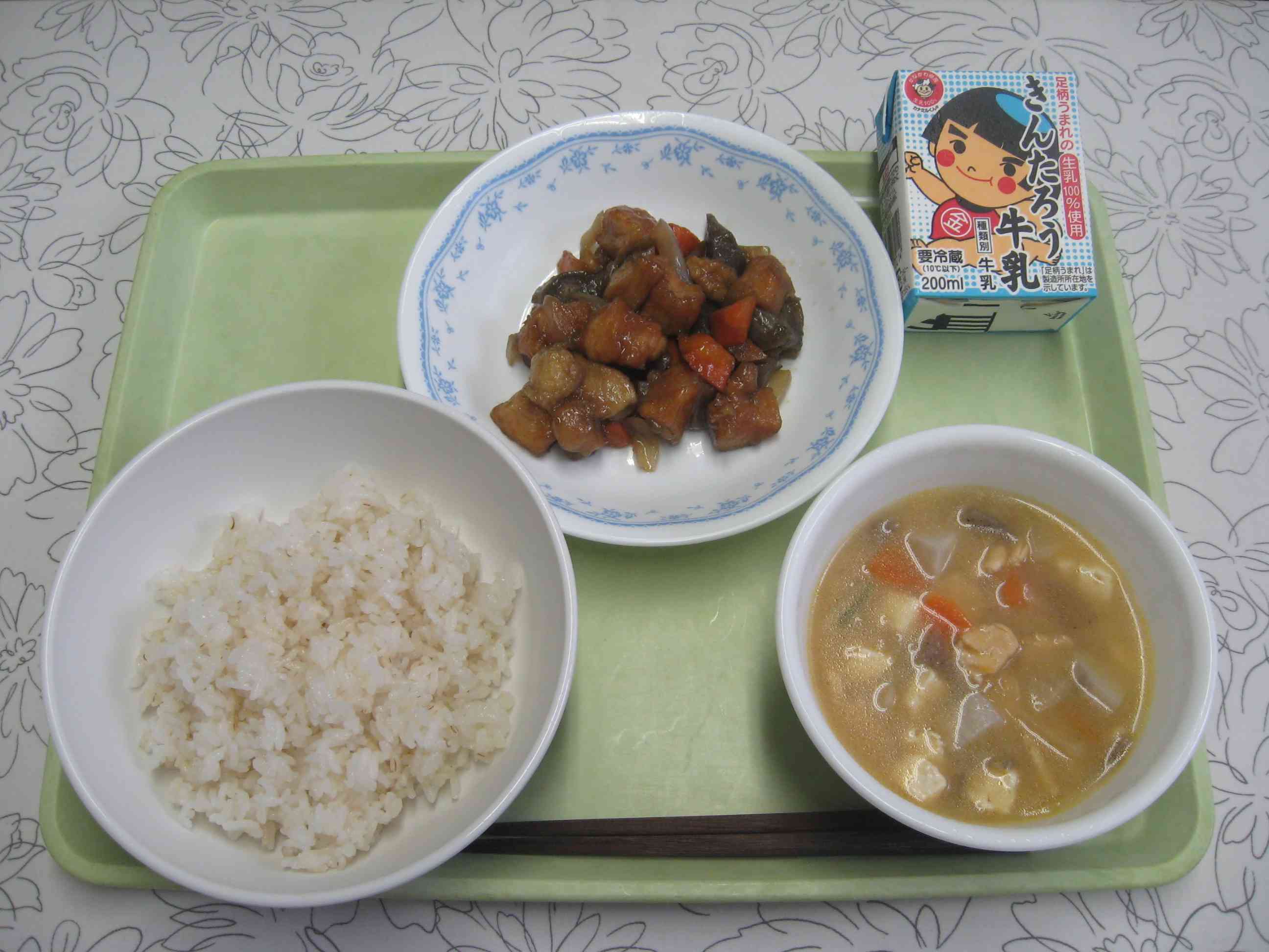 【今日のメニュー】 麦ごはん、打ち豆汁、チキンチキンごぼう、牛乳 【栄養教諭から】 今日は、小中一貫教育共通献立の日です。町の4校で共通の献立は、福井県の郷土料理の「打ち豆汁」です。打ち豆とは水に浸した大豆を木づちで打ち乾燥させたもので、福井県では伝統的な大豆の保存食です。打ってつぶすことで、乾燥する時間も調理する時間も短くてすむのが特徴です。時短料理がはやる昨今、栄養満点で注目すべき食材かもしれませんね。【添付ファイル】