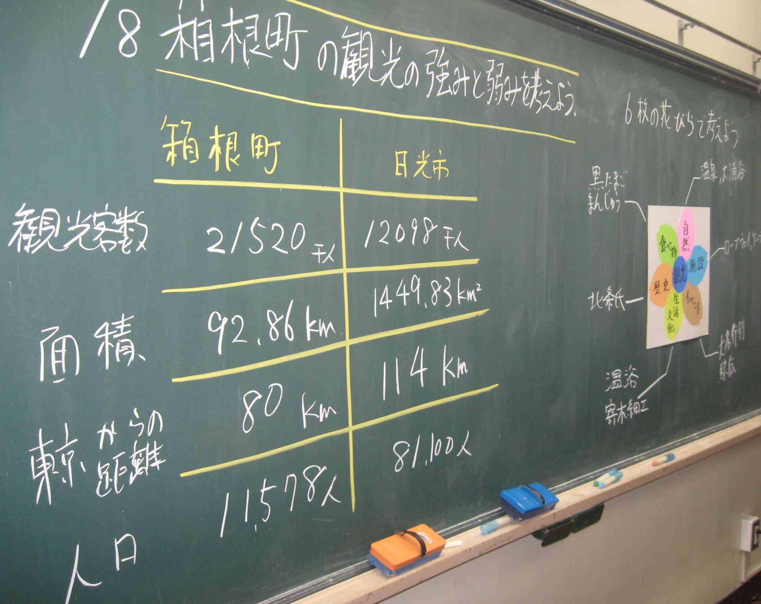 先週の金曜日に、6年生が観光学習を行いました。玉川大学の教授による出前授業です。 「箱根町の観光の強みと弱みを考えよう」をテーマに学習。自然、施設、歴史、イベント、食べ物、生活文化をヒントに、修学旅行で出かけた日光と比較しながら、グループごとに話し合い発表しました。 この日の授業には、箱根町の小中学校から、参観者もありました。大勢の大人に囲まれて緊張もしていたようですが、6年の子どもたちは様々な意見を出し、考え合うことができました。 授業後には教員同士で「箱根町の特性を生かした観光学習の授業の在り方」について協議しました。 箱根町では、各学校で地域のことを学習する「箱根教育」を進めています。地域の方々にご協力いただきながら、この学習の積み重ねてきたことで、ふるさと「箱根」を好きな子どもたちが多いのも自慢です。これからの課題は、調べて大好きになった「箱根のことをいかに発信していくか」です。子どもたちと一緒に考えていきたいと思います。【添付ファイル】