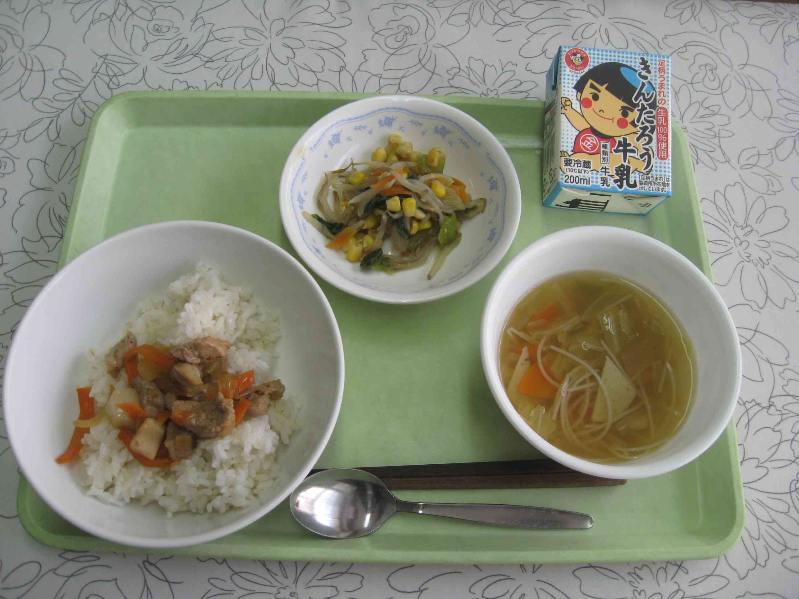 【今日のメニュー】 ルーローハン、ビーフンスープ、青菜とコーンのソテー、牛乳 【栄養教諭から】 今日は、台湾のローカルフード「ルーローハン」です。豚肉を甘辛く煮てごはんにのせた料理です。八角を入れるのが特徴ですが、給食では入れずにオイスターソース等で味にアクセントをつけました。 作り方を調べると、付け合わせでゆで卵と青梗菜(チンゲンサイ)を添えているのを目にします。そこで、今日のソテーの青菜は青梗菜を使用しました。【添付ファイル】