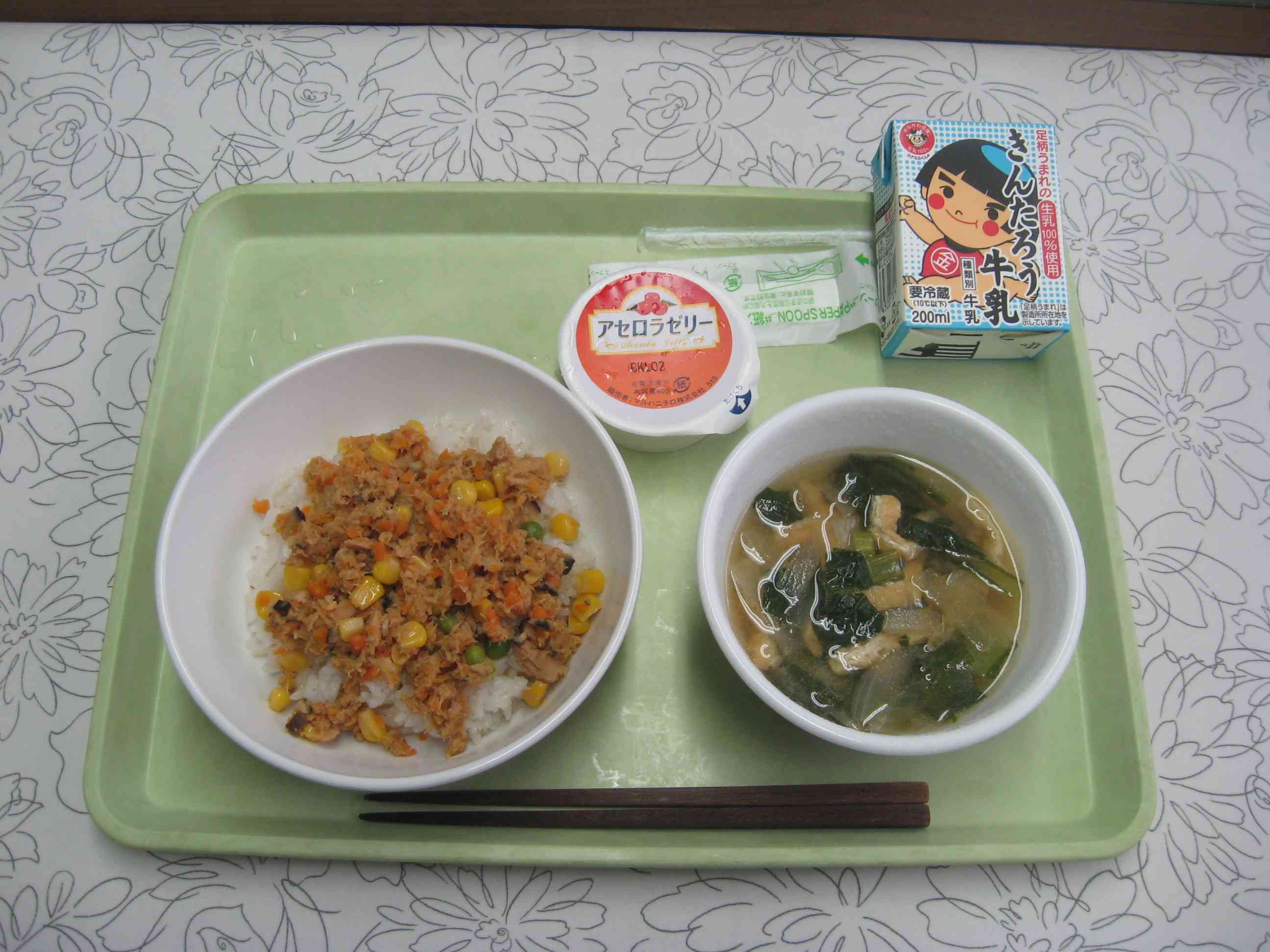 【今日のメニュー】 ツナのそぼろご飯、大根のみそ汁、アセロラゼリー、牛乳 【栄養教諭から】 今日は、短縮日課のため、子どもたちが時間をかけずに食べやすい献立にしました。 ツナのそぼろ丼の中には、人参、干しシイタケ、グリンピース、コーンを入れて、彩りと栄養バランスを考えて作りました。
