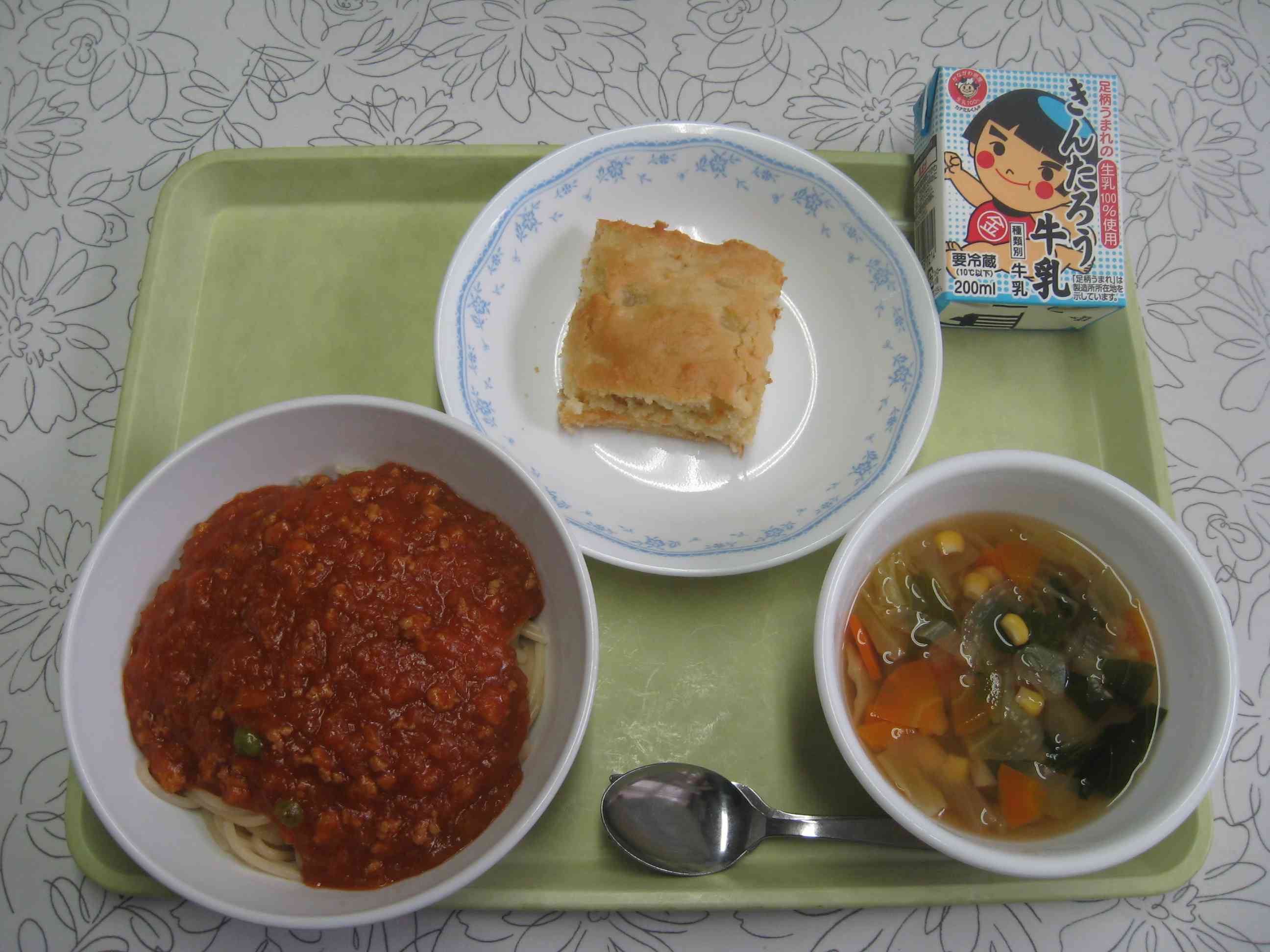 【今日のメニュー】 スパゲティミートソース、野菜スープ、アップルケーキ、牛乳 【栄養教諭から】 今日は、湯本幼児学園の年長さんたちが、入学前の交流で給食を食べに来てくれました。来年入学予定の子どもたちなので、「学校の給食もおいしい!」と思ってもらえるように、いつも以上に心を込めました。とは言え、計27人分の増。本校にとっては、普段より2クラス以上の増加です。調理員さんも頑張って作ってくれました。調理員さんには感謝の気持ちでいっぱいです。【添付ファイル】