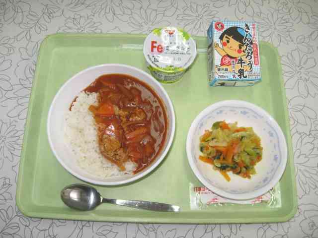【今日のメニュー】 ハヤシライス、キャベツと青菜の炒め物、Feヨーグルト、牛乳 【栄養教諭から】 今日は、ハヤシライスです。玉ねぎとブラウンルウでコクのあるハヤシライスに仕上がりました。ソテーは、冬キャベツのため少しかたかったので、蒸しながら炒めて、甘くやわらかくできました。