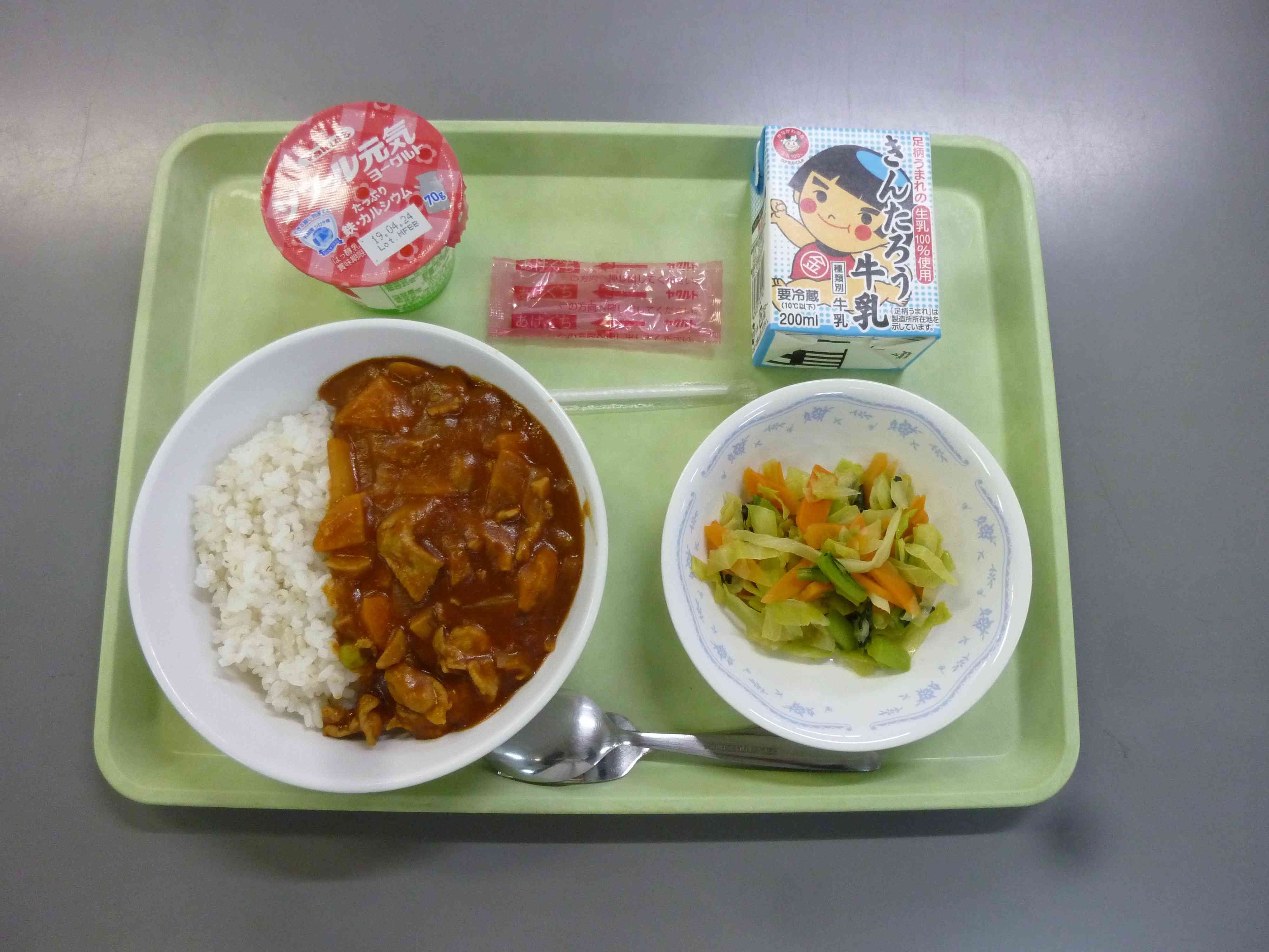 【今日のメニュー】 ハヤシライス、牛乳、キャベツとあおなのいためもの、元気ヨーグルト 【栄養教諭から】 今日から今年度の給食が始まります。最初の給食は「ハヤシライス」です。実は毎年、年度始めの給食は、ハヤシライスにしています。その理由は、子ども達が好きで配膳がしやすいため。そして、カレーより辛さもないためハヤシライスにしました。休み中不足しがちなカルシウムも補うため、ヨーグルトもつけています。 今年度も栄養満点でおいしく安全な給食を提供できるよう頑張ります。【添付ファイル】