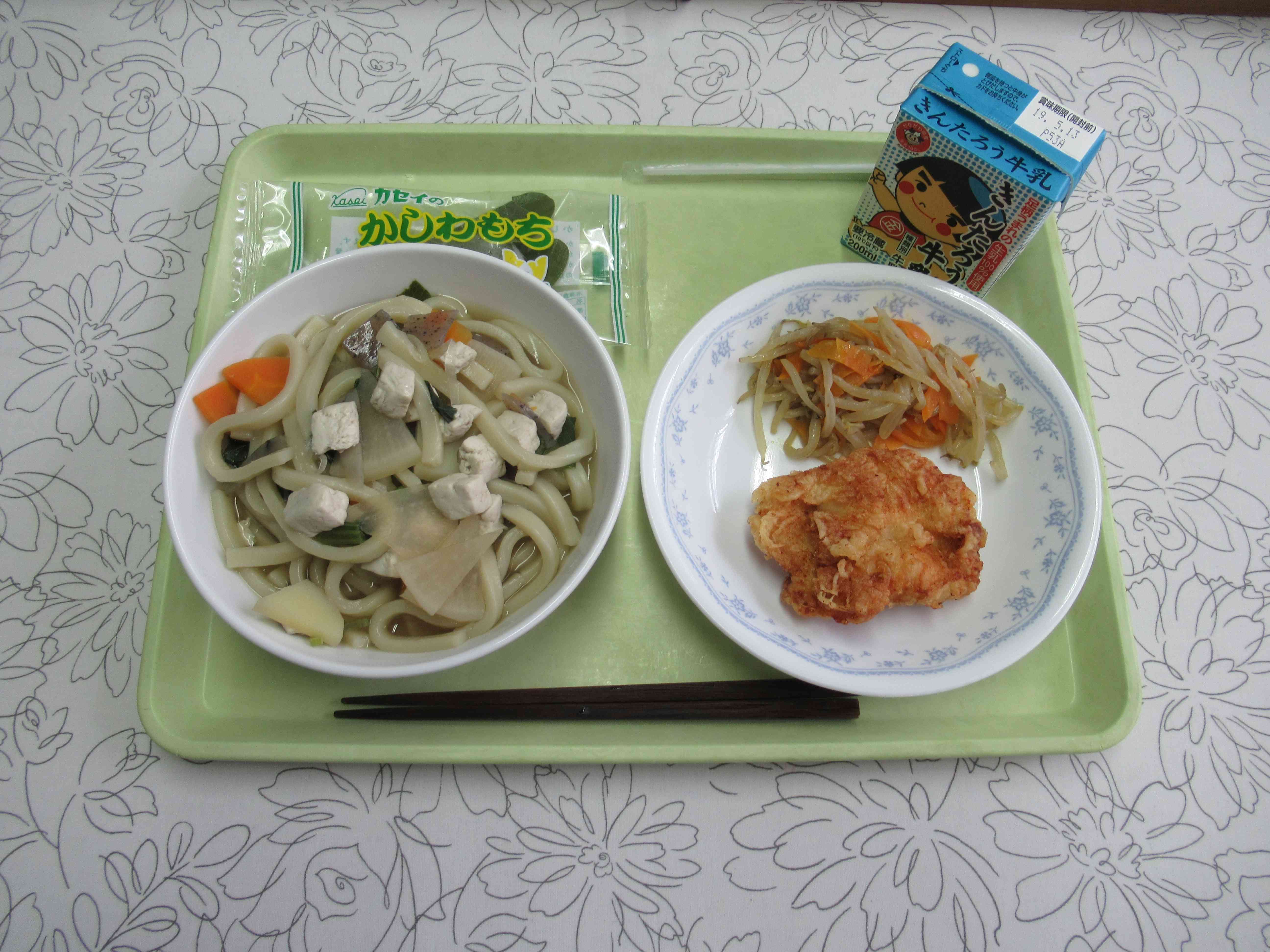 【今日のメニュー】 けんちんうどん 牛乳 とり天 もやしのピリ辛炒め 柏餅 【栄養教諭から】 久しぶりの学校で、朝、1年生の子が「今日うどんでしょ!?好きなんだ!」と声をかけてくれました。給食を楽しみにしていることがわかって、とても嬉しくなりました。 今日は二日遅れですが、子どもの日のお祝いに柏餅をつけました。新しい葉が出てから古い葉が落ちる柏の木は子孫繁栄の縁起物。新しい時代を担う子どもたちの成長を願って、令和最初の給食に出しました。【添付ファイル】