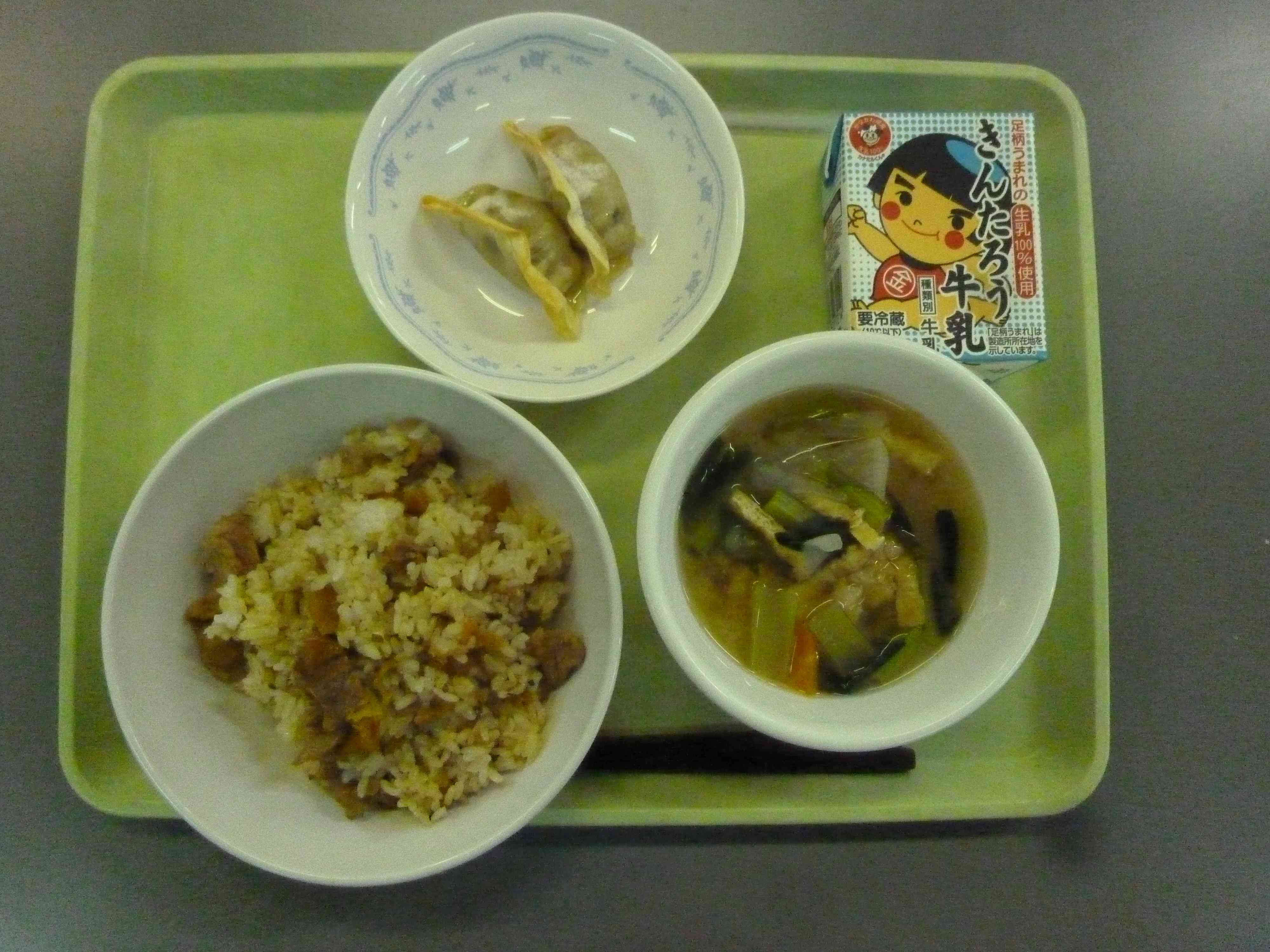 【今日のメニュー】 キムタクごはん 牛乳 具だくさんみそ汁 お魚くんギョウザ 【栄養教諭から】 お魚くんギョウザは、三崎港で水揚げされたカジキを使って作られています。とてもジューシーで、子どもたちも魚から作られていることに驚いています。加工品を使用する際も、できる限り地場産物を取り入れるように心がけています。