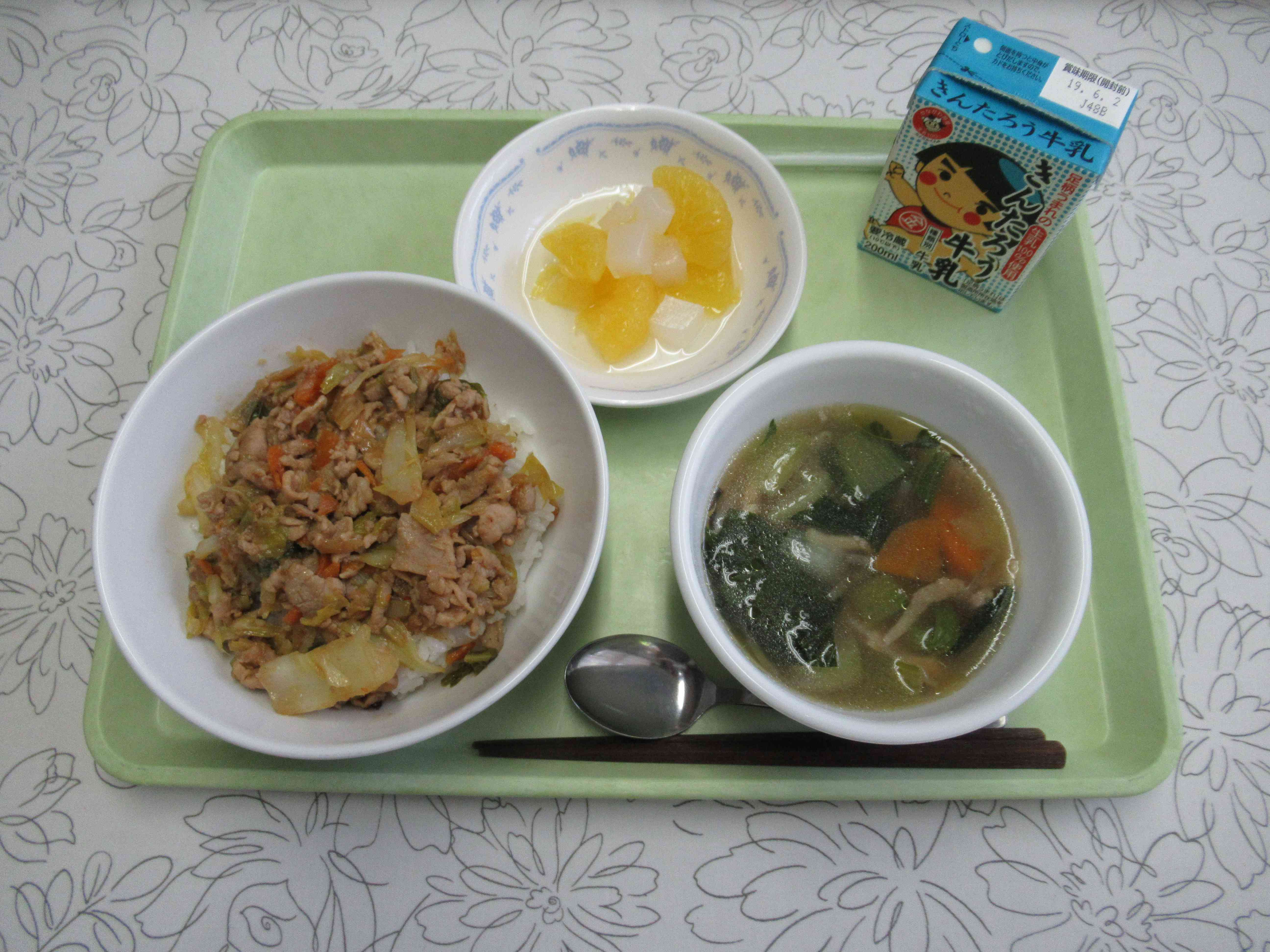 【今日のメニュー】 ホイコーロー丼 牛乳 チンゲンサイのスープ 甘夏&ナタデココ 【栄養教諭から】 今日の午前中、子どもたちは水泳の授業でしたので、準備が早く、また疲れていても食べやすいように、ホイコーローは丼にしました。予想以上に暑くなった今日は、さっぱりとした甘夏とナタデココが、よりおいしく感じると思います。