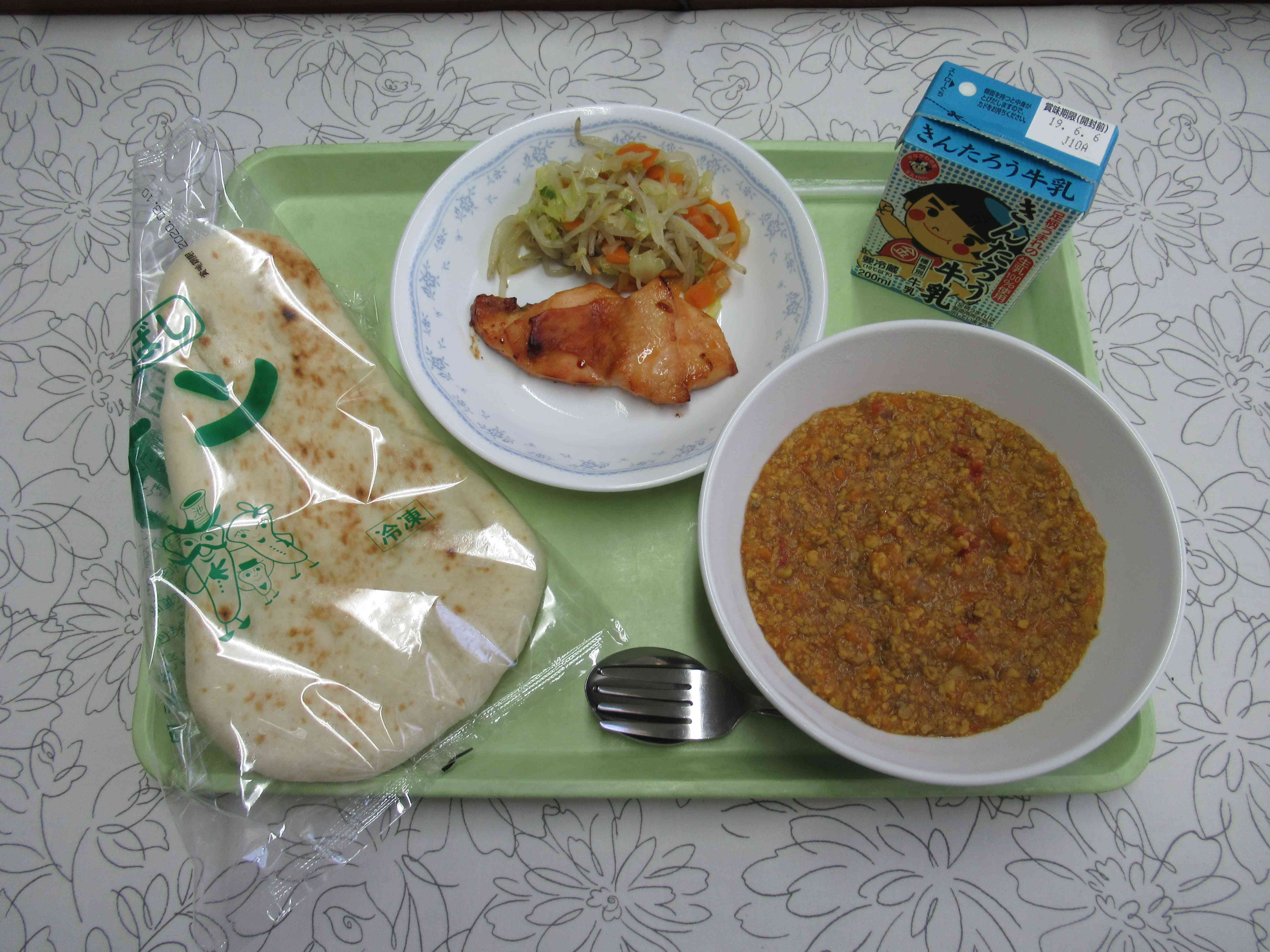 【今日のメニュー】 ナン 牛乳 キーマカレー ハニーマスタードチキン オイスター炒め 【栄養教諭から】 今日のパンは「ナン」です。キーマカレーには、野菜とおなじみの高野豆腐、そしてひよこ豆を細かくして入れました。久しぶりの「ナン」に、子どもたちは何日も前から楽しみにしていました。