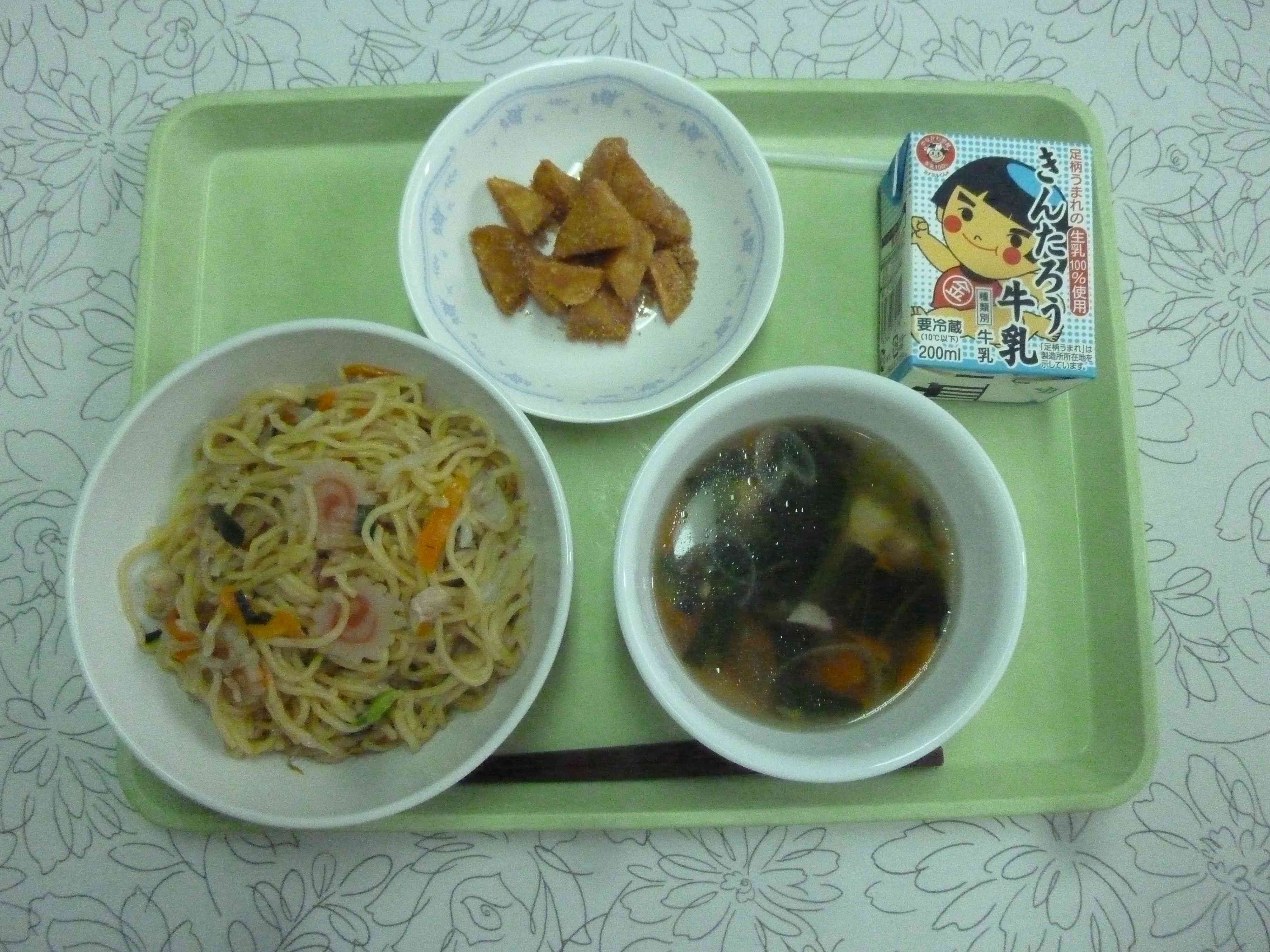 【今日のメニュー】 塩やきそば 牛乳 中華スープ きなこポテト 【栄養教諭から】 きな粉ポテトは北海道出身の栄養士さんから教わった献立です。素揚げしたじゃがいもにきな粉シュガーをまぶすだけの簡単なもの。北海道の学校給食ではよく出る献立だそうですが、どうやら全国的にも出されている地域は多いようですね。簡単ではありますが、じゃがいもからはビタミンC、きな粉からは良質なたんぱく質を摂取できる料理です。