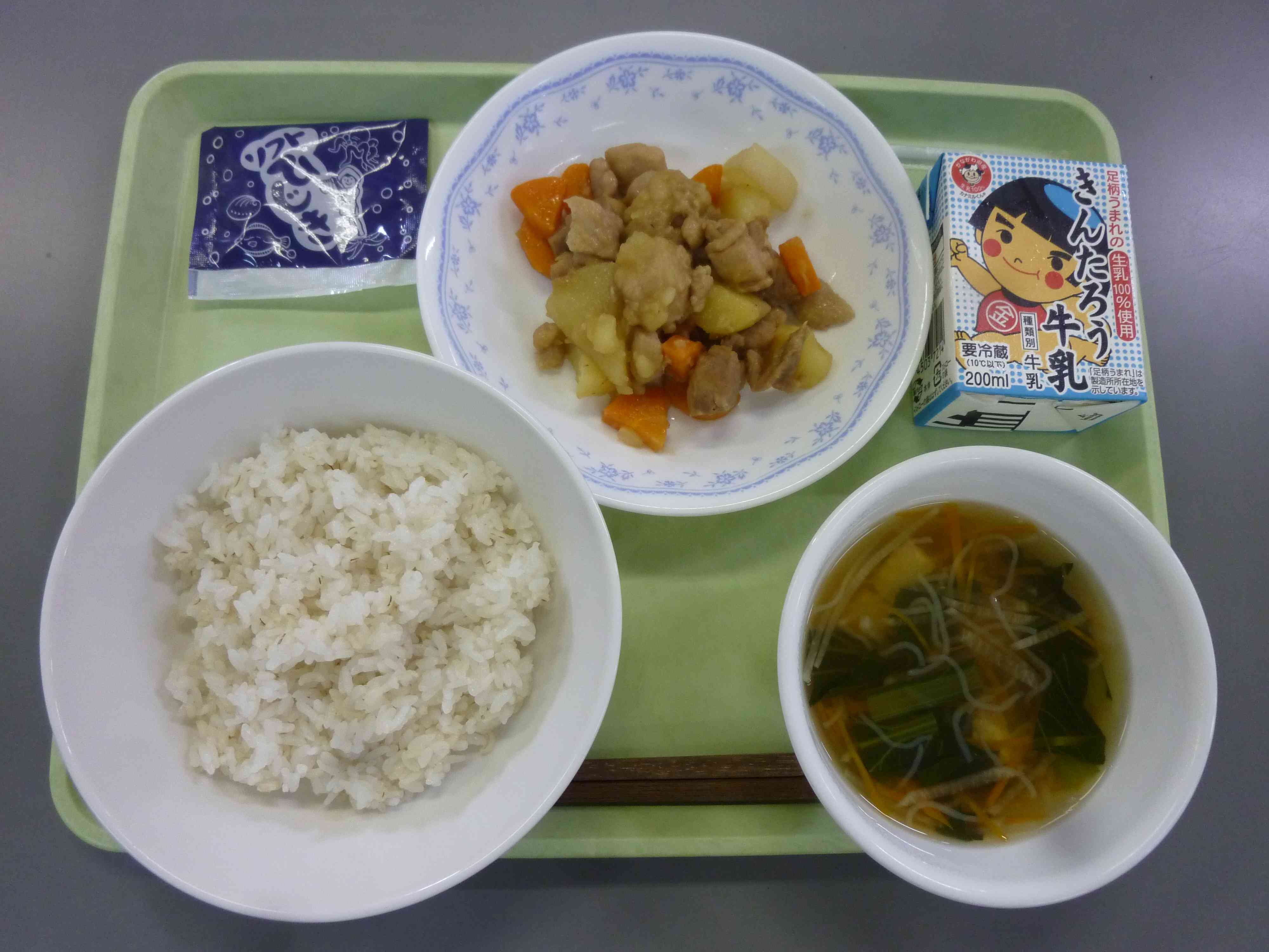 【今日のメニュー】 麦ご飯 牛乳 ソフトひじき さわにわん とりのさっぱり煮 【栄養教諭から】 今日は蒸し暑い日でも、さっぱり食べられるお酢を使った料理です。鶏肉と一緒に大根・人参・じゃが芋を煮ました。酢には疲れをとる働きもあります。残さず食べて、週の後半も元気に過ごしましょう。