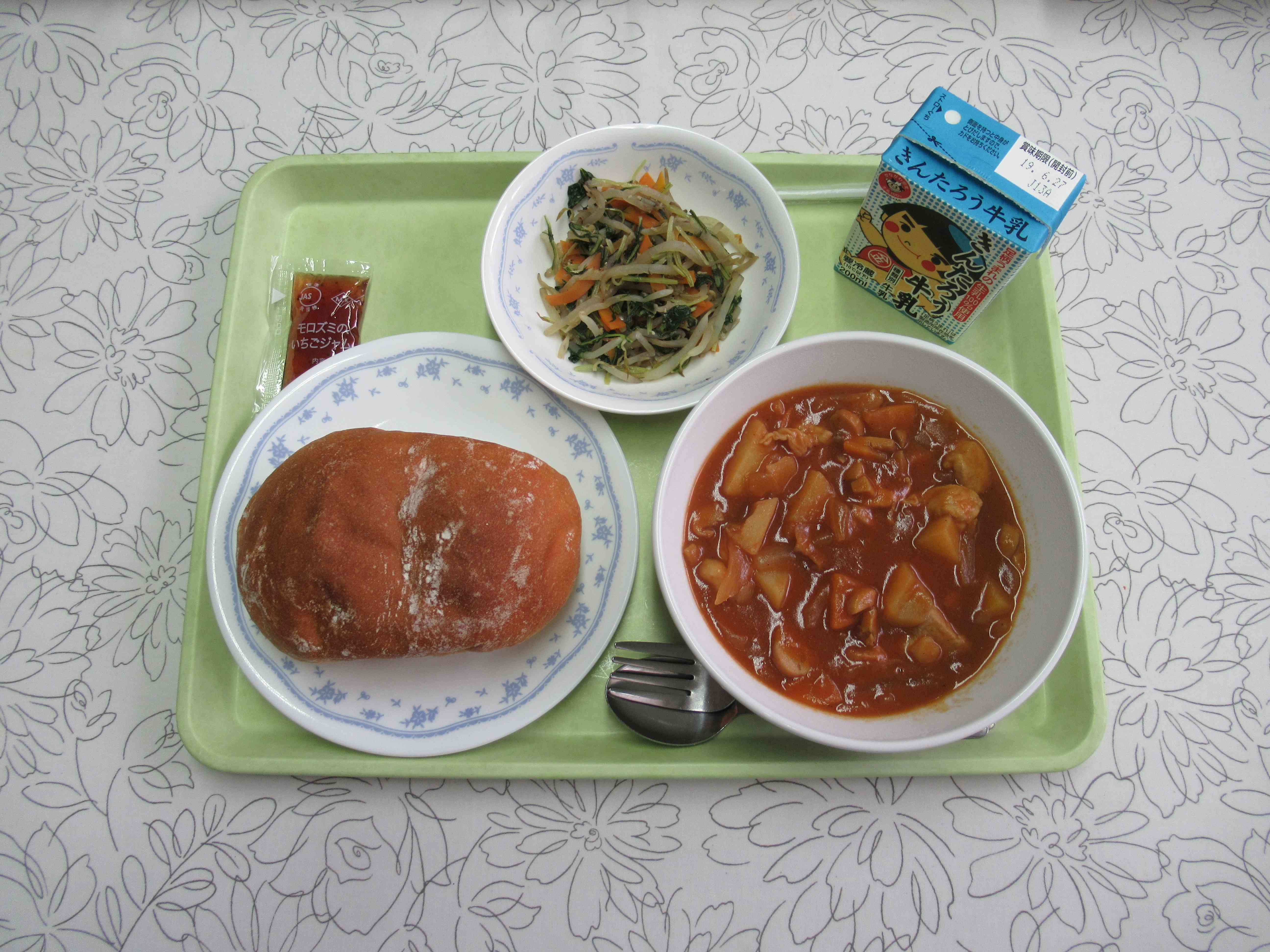 【今日のメニュー】 フランスパン いちごジャム 牛乳 ポークシチュー じゃこと水菜のソテー 【栄養教諭から】 今日はソテーに水菜を使いました。京都の伝統野菜の一つである水菜は、本来冬が旬の野菜ですが、今ではハウス栽培により一年中出回っています。シャキシャキが残るように火加減と時間に気を付けて作りました。