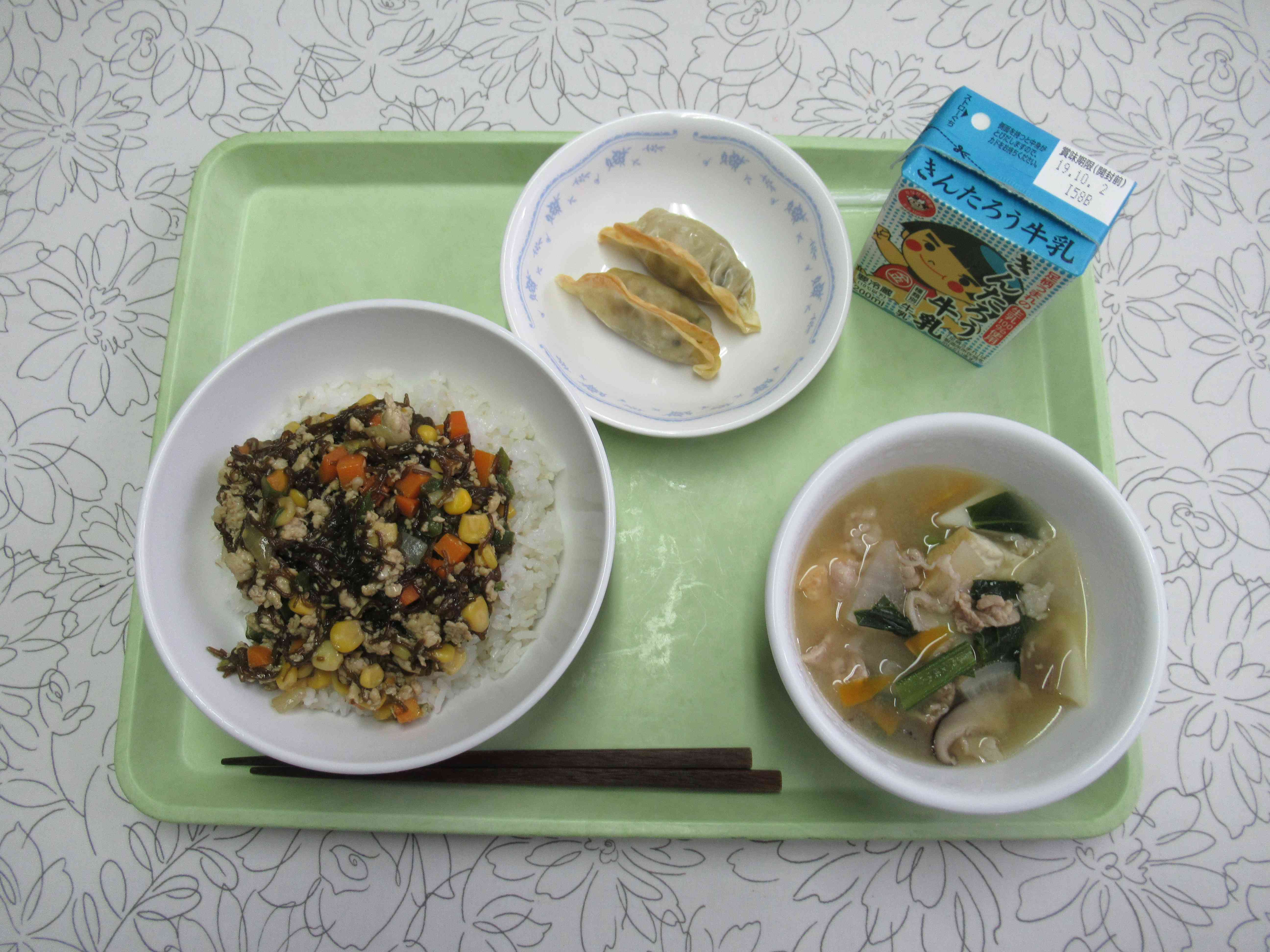 【メニュー】 もずく丼 牛乳 イナムドュチ お魚くんぎょうざ 【栄養教諭から】 今日の給食は沖縄フェアです。沖縄産のもずくとコロコロの野菜を甘辛く炒めました。もずくのぬめりが苦手な子が多いのですが、ミネラルたっぷりの食品ですので、残さず食べてほしいです。イナムドュチは沖縄県の郷土料理です。白味噌仕立ての具だくさんのおつゆでお祝いのときに食べるそうです。