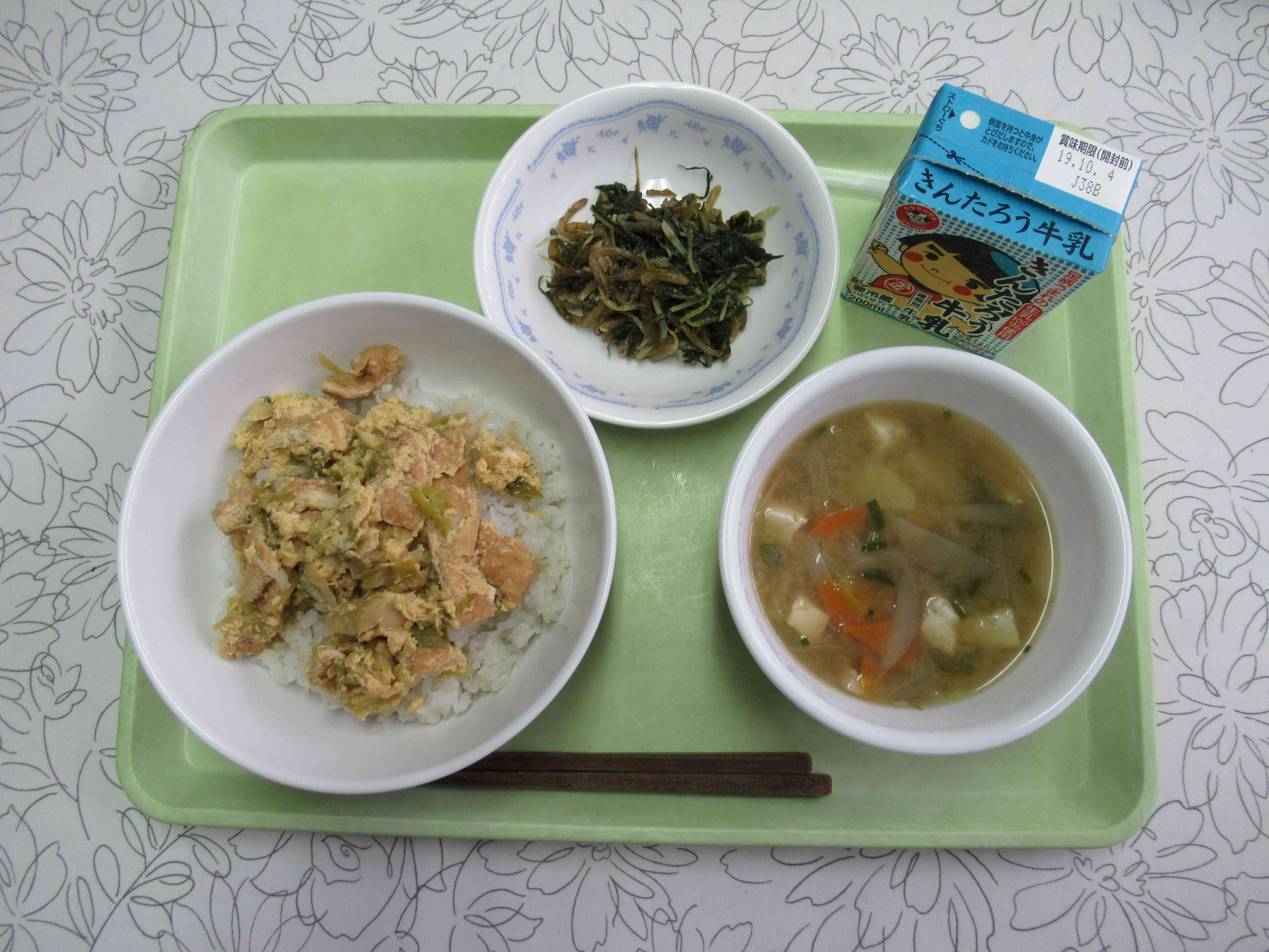 【メニュー】 衣笠丼 牛乳 野菜のみそ汁 水菜の磯和え 【栄養教諭から】 今日は小中一貫教育共通献立の衣笠丼です。京都府のご当地丼ぶりで、油揚げと長ねぎを甘辛く煮て、卵でとじたものです。衣笠山に由来し、雪景色の衣笠山に見立てたという説や衣笠山にはキツネがいるからという説などがあるそうです。今日は京都にちなんで水菜の磯和えと組み合わせました。