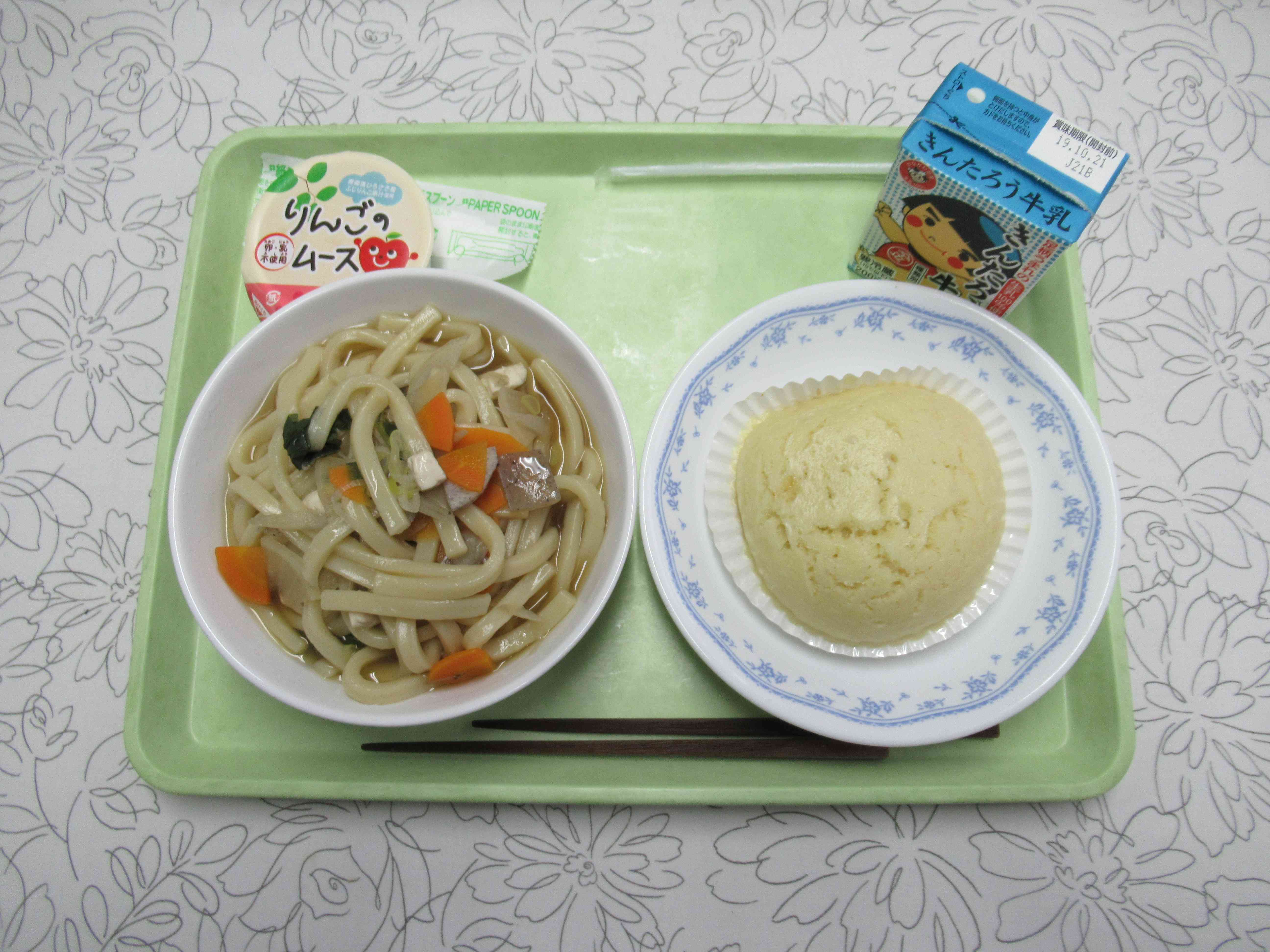 【メニュー】 けんちんうどん 牛乳 肉まん りんごのムース 【栄養教諭から】 今日は手作りの肉まんです。生地はホットケーキミックスにサラダ油とヨーグルトをまぜて作ります。中身は肉だけでなく人参・玉ねぎ・たけのこ・しいたけと野菜もたくさん入っています。カップに流し入れると簡単ですので、ご家庭でもぜひ作ってみてください。