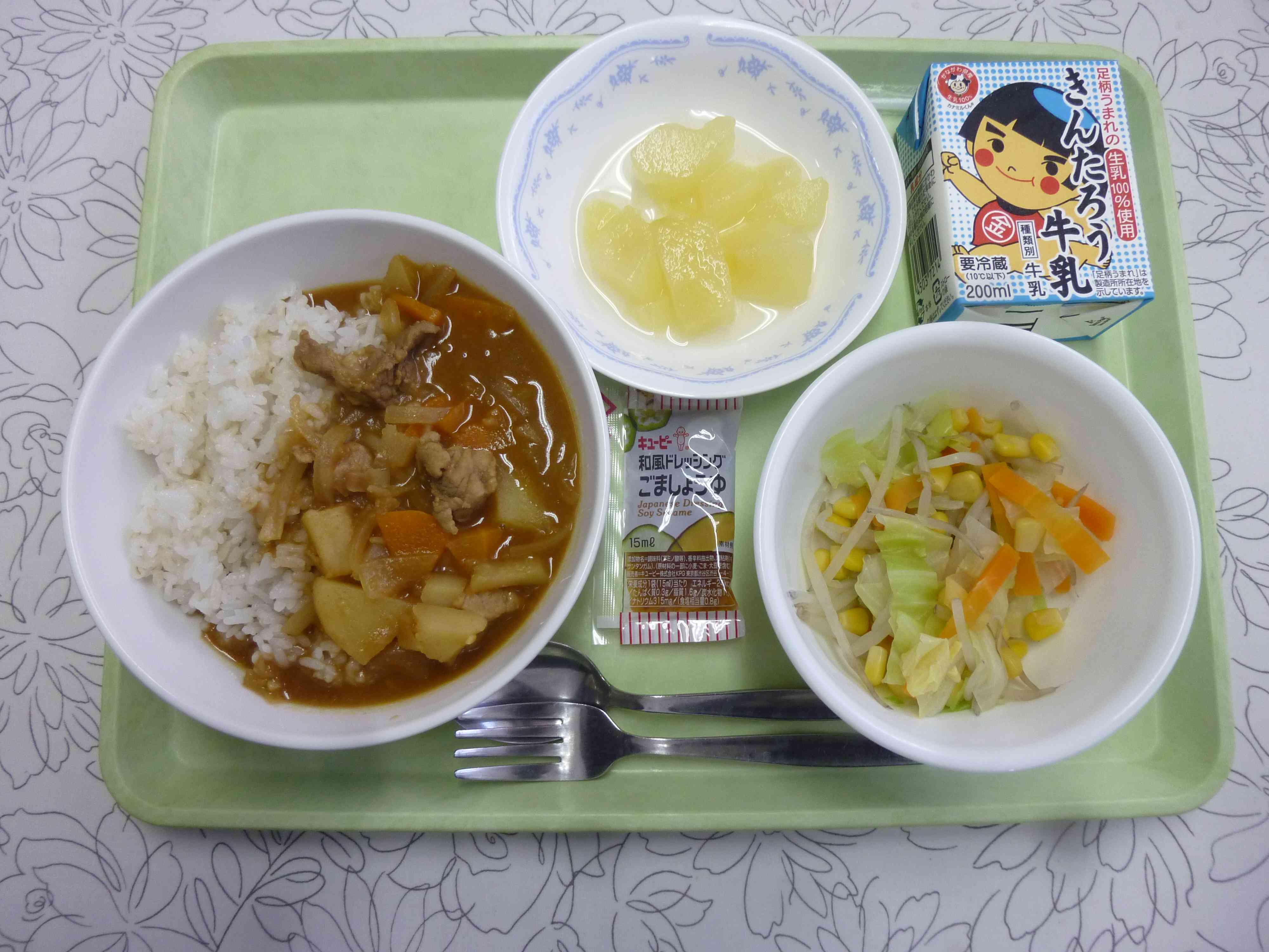 【メニュー】 カレーライス 牛乳 ゆで野菜 和風ごまドレッシング ラ・フランス缶 【栄養教諭から】 今日は今が旬の果物、ラ・フランスを出しました。残念ながら、給食では缶詰での提供ですが、季節の果物を知ってほしいと思い、出しました。秋は果物もたくさん旬を向かえます。ぜひ、色々な種類の果物を食べてほしいです。