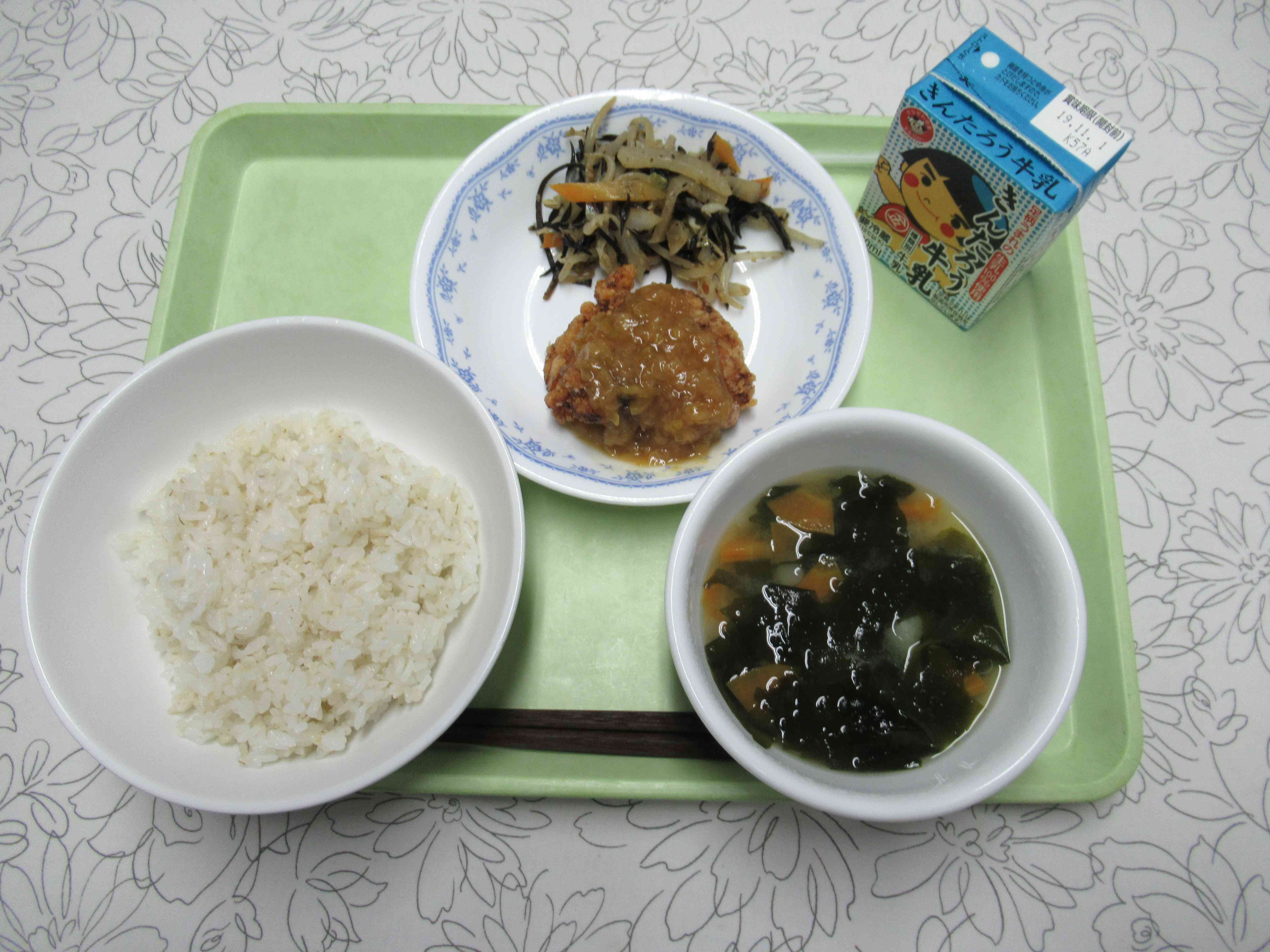 【メニュー】 麦ごはん 牛乳 みそ汁 鶏のから揚げネギソース ひじきのごま酢炒め 【栄養教諭から】 今日はネギソースをかけたから揚げです。ごま油でネギをよく炒め、醤油ベースの甘酢あんに仕上げました。ご家庭で作る際もネギは緑の部分も使うことをお勧めします。緑の部分にはカロテンが多く含まれます。カロテンは脂溶性ですので、油と一緒にとるとよいです。