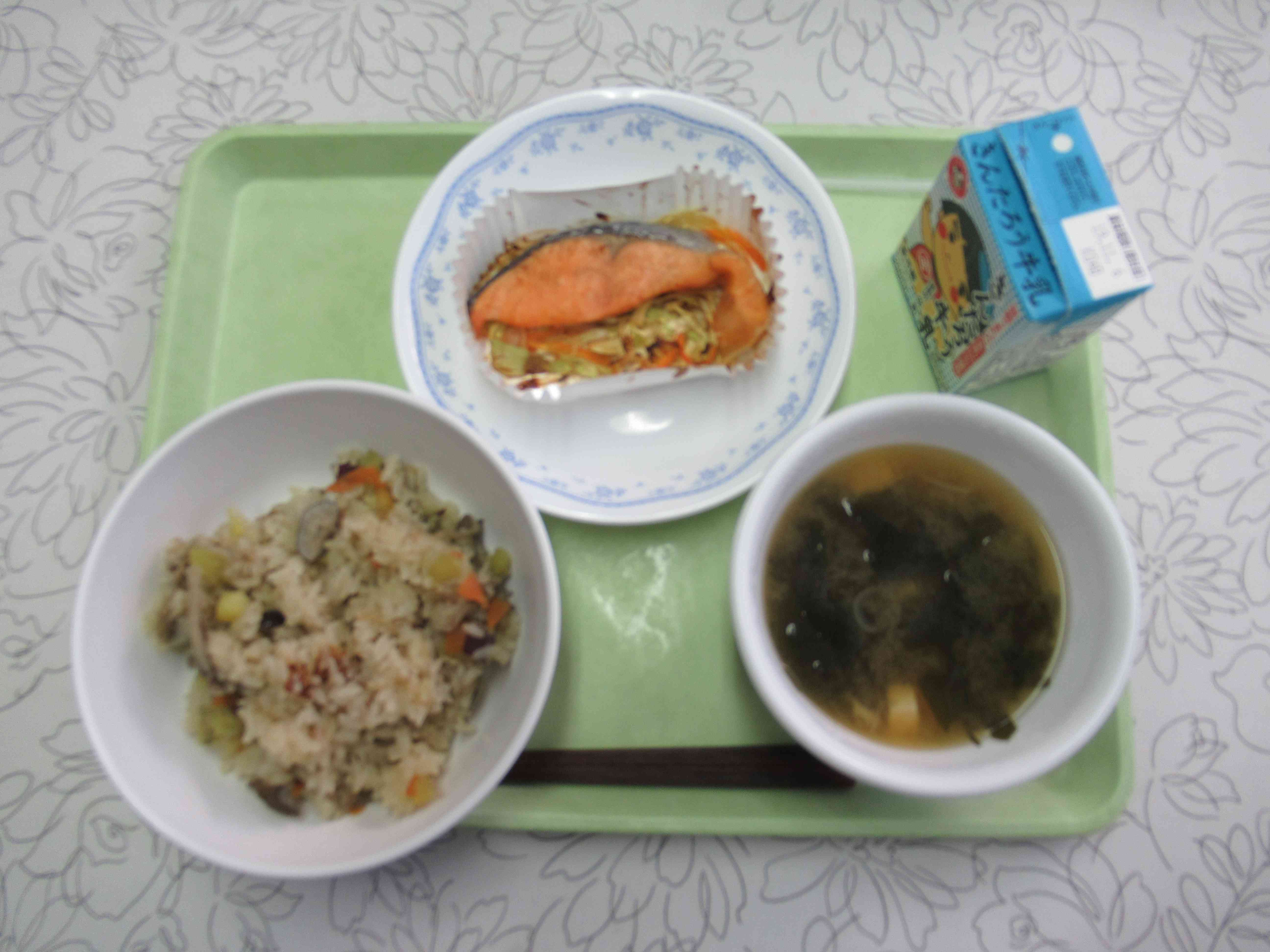 【メニュー】 秋の香りごはん 牛乳 豆腐とわかめの味噌汁 鮭のチャンチャン焼き 【栄養教諭から】 今日は秋のおいしい香りがただよう炊き込みごはんです。しめじ、舞たけ、さつまいもが入っています。3割程もち米を入れておこわにしました。ビタミンや食物繊維が豊富なきのこ。またうま味もプラスされるので、たくさん食べてほしいですね。