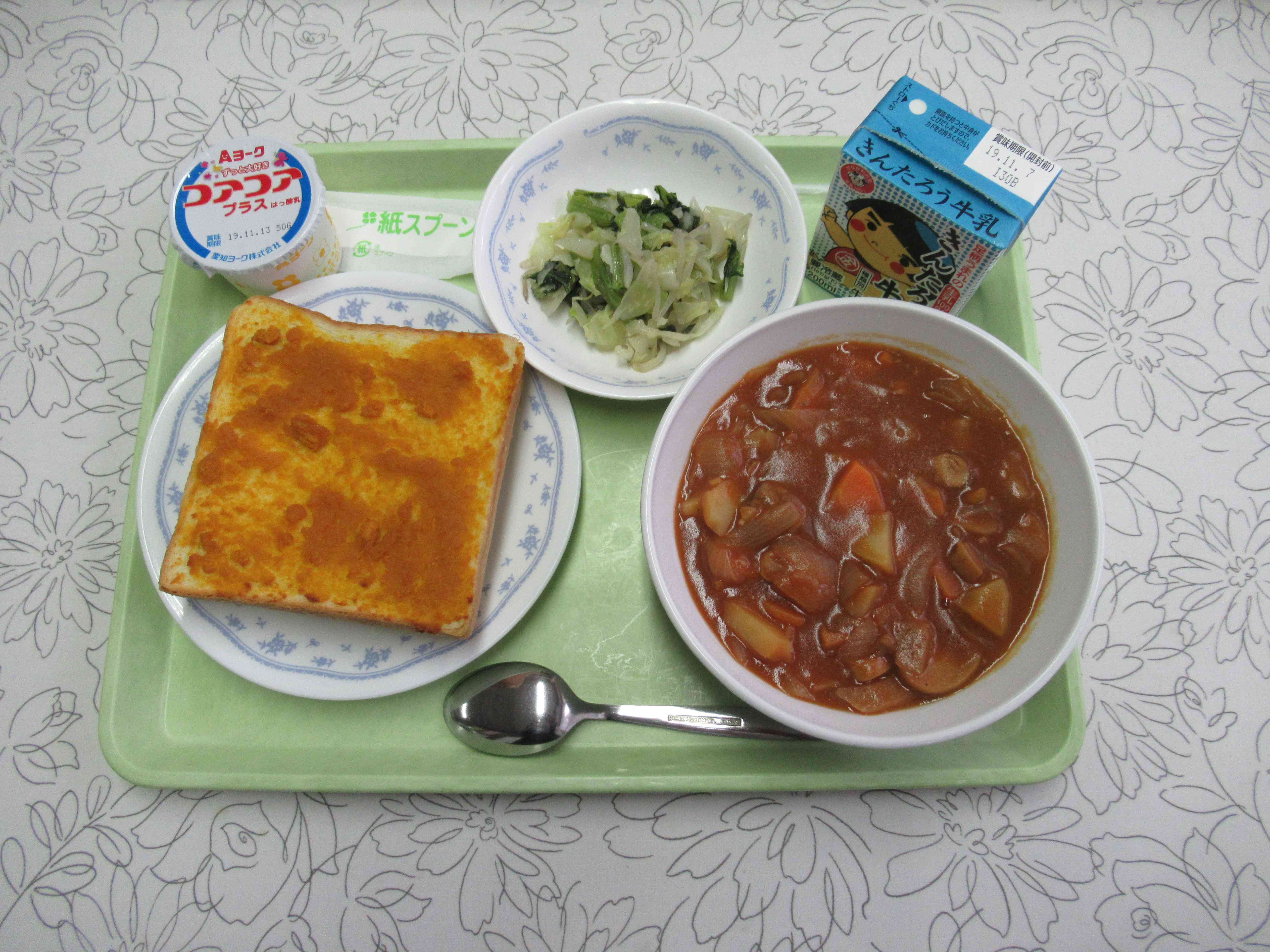 【メニュー】 パンプキントースト 牛乳 ポークシチュー キャベツのソテー ヨーグルト 【栄養教諭から】 今日はハロウィンということで、パンプキントーストです。カボチャのペーストに、はちみつやシナモンを混ぜました。カボチャの味を活かして砂糖は少なめにしました。