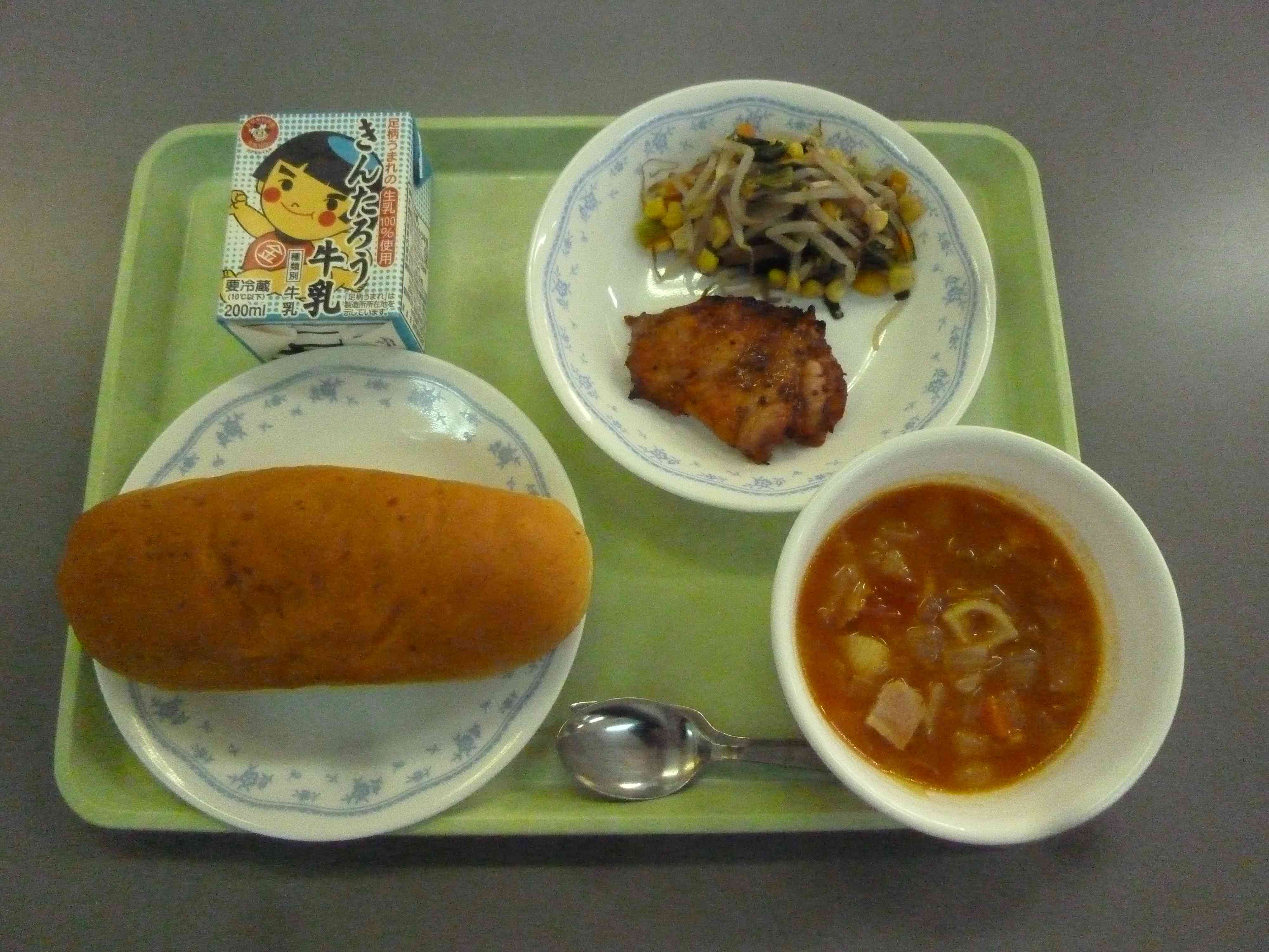 【メニュー】 げんまいパン 牛乳 ミネストローネ ハニーマスタードチキン 青菜とコーンのソテー 【栄養教諭から】 今日のハニーマスタードチキンは、粒マスタードで作りました。以前は、洋がらしをとかずに混ぜて、さわやかな味わいに仕上げていました。粒マスタードを使うと、からさがほとんどないため、しっかりマスタードの味を活かせます。子ども達はよくパンにはさんで食べています。