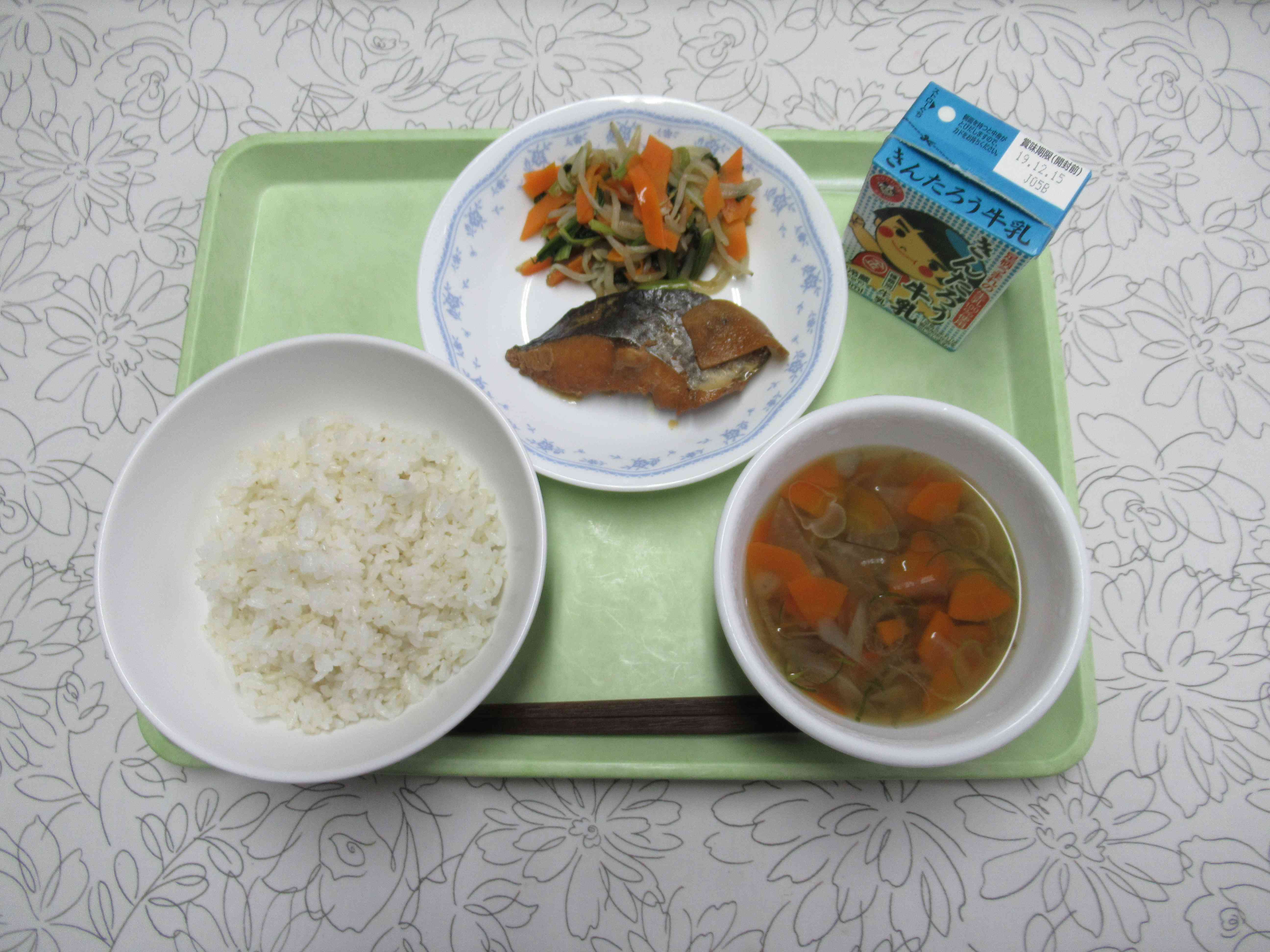 【メニュー】 麦ごはん 牛乳 のっぺい汁 さわらの生姜煮 もやしと小松菜のからし醤油 【栄養教諭から】 のっぺい汁は、新潟県等多くの県で郷土料理として親しまれています。のっぺりととろみがあるのが特徴で、寒い日にはぴったりの料理です。とろみのもとは里芋です。