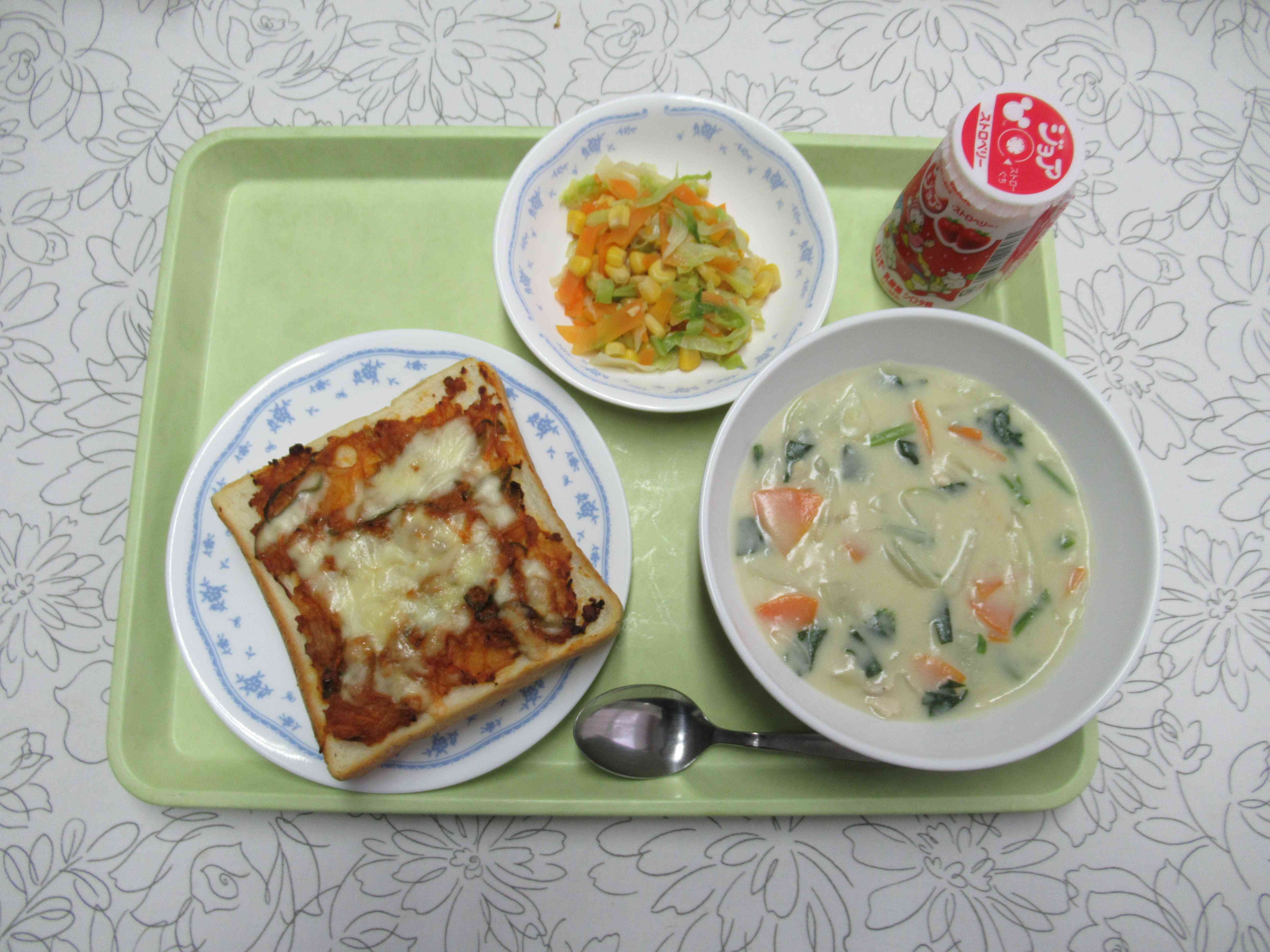 【メニュー】 ピザトースト ジョアストロベリー ホワイトシチュー 三色ソテー 【栄養教諭から】 今日はピザトーストです。子どもたちも大好きな食べ物ですね。同じピザトーストでも中身を少し変えたりしています。前回はツナピザだったので、今回は鶏ひき肉のチキンピザにしました。今年の給食もあと3回。最後まで安心・安全・おいしい給食を作っていきます。