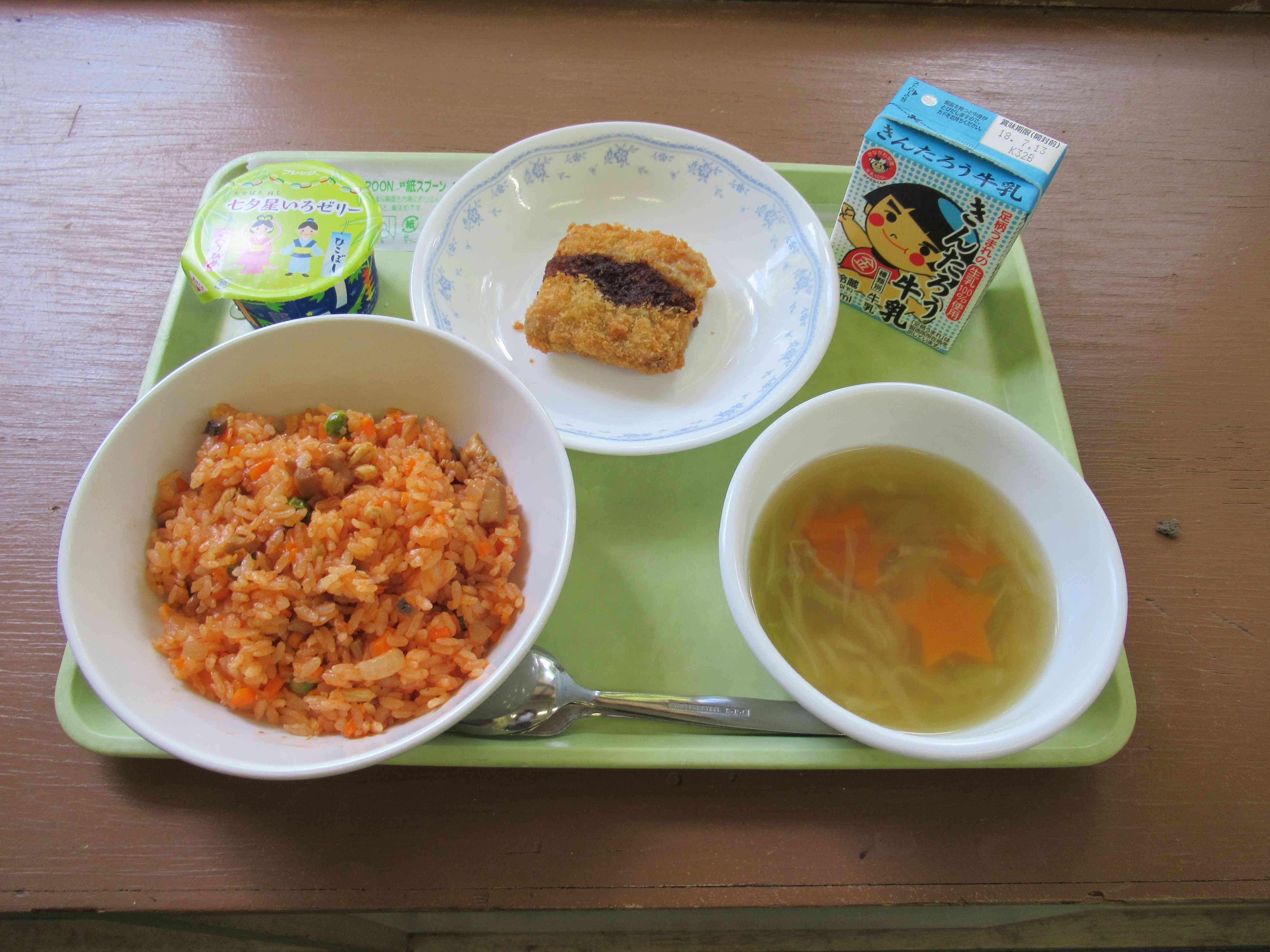 今日は2日遅れですが、七夕献立です。天の川スープには星型にぬいたにんじんと星型のマカロニを入れました。野菜の型抜きは行事食のときにおこないます。食缶のふたを開けたときの子ども達の笑顔がいつも楽しみです。
