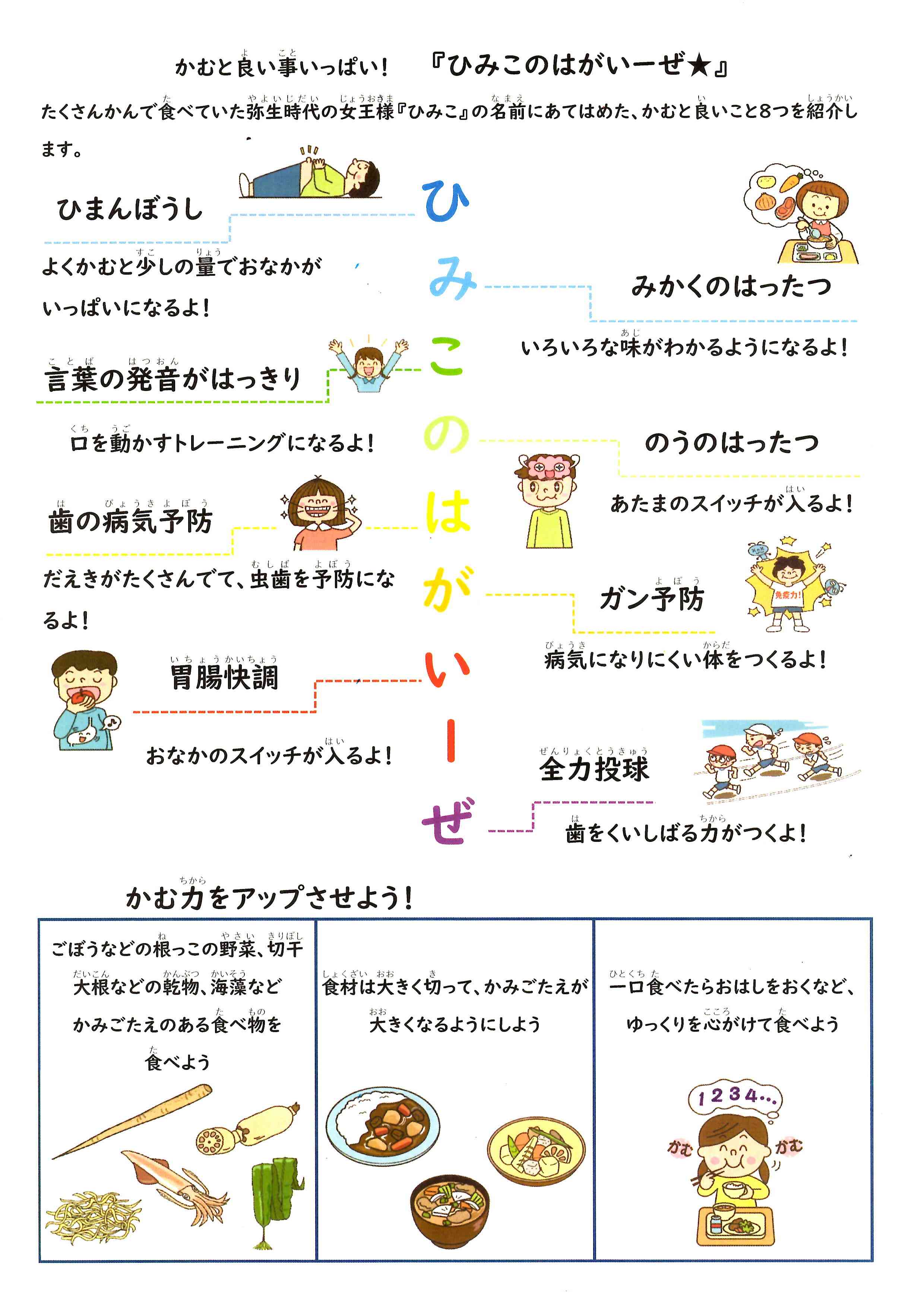 みなさんは、8020運動というのを知っていますか?「80歳になっても20本以上自分の歯を保とう」という運動です。 みなさんにとって80歳はまだまだ先ですが、元気な歯の土台は子どもの時から作られます。 よくかむと良いことがたくさんあります。6月は虫歯予防デーもありますので、毎日の食事もいつもよりよくかんで食べましょう。