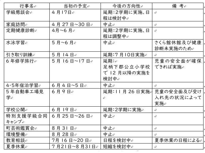 いよいよ、学校が再開します。 湯本小学校の授業日は6月5日(金)です。 再開に当たっては、集団感染発生のリスクを高める三つの条件「換気の悪い密閉空間」「多数が集まる密集」「近距離での会話や発声の密接場面」、いわゆる三密を回避することが求められています。教育活動の様々な場面を想定しながら対応方法を検討しました。まずは、29日に郵送しました「保健だより」等をお子さんと一緒にご覧いただければ幸いです。 また、学校行事についても、この視点を考慮し、中止・延期・縮小・内容等の工夫が必要になってきます。現時点での町や学校の方向性をお示ししますので、ご理解のほどよろしくお願いします。【添付ファイル】