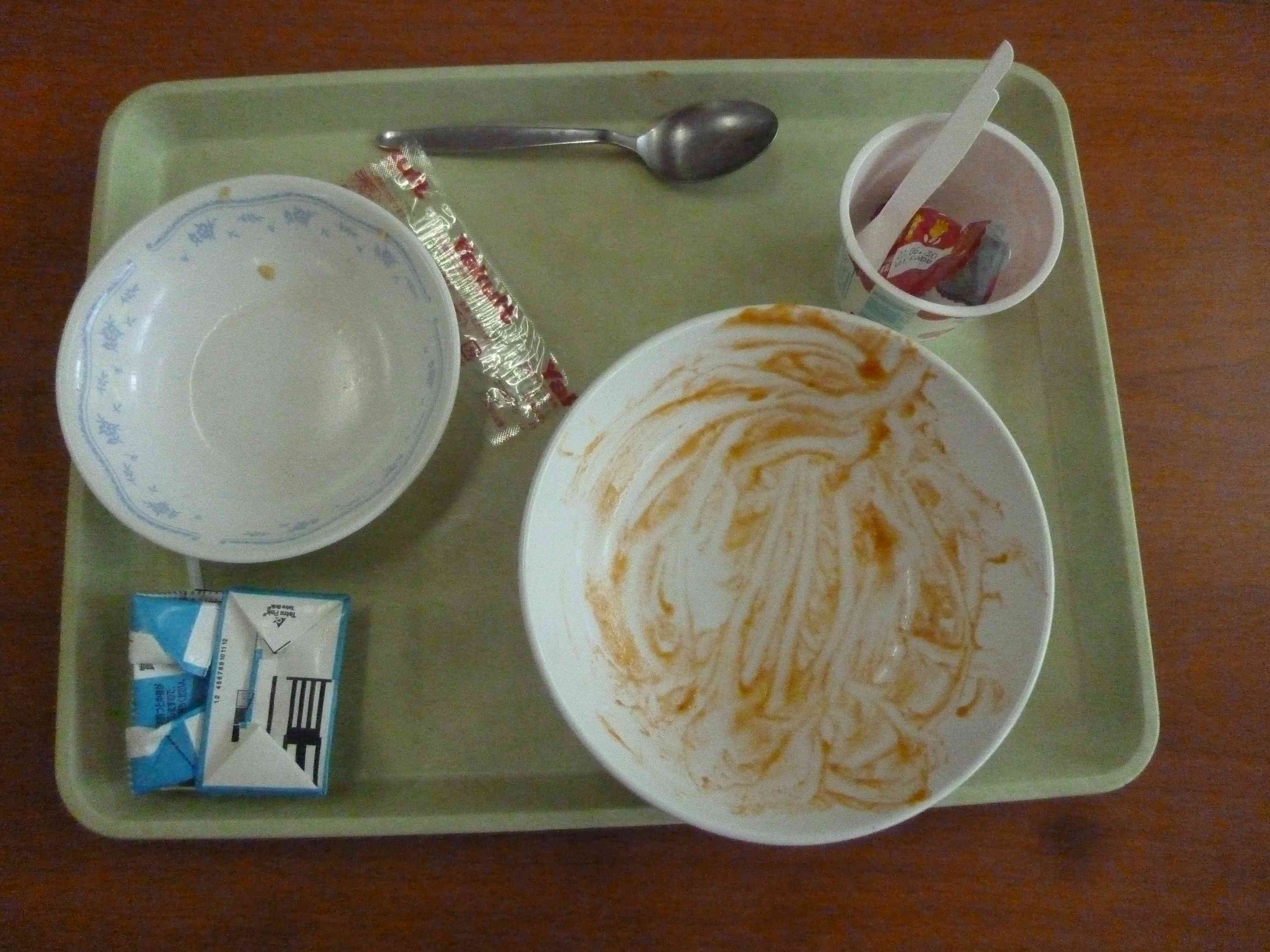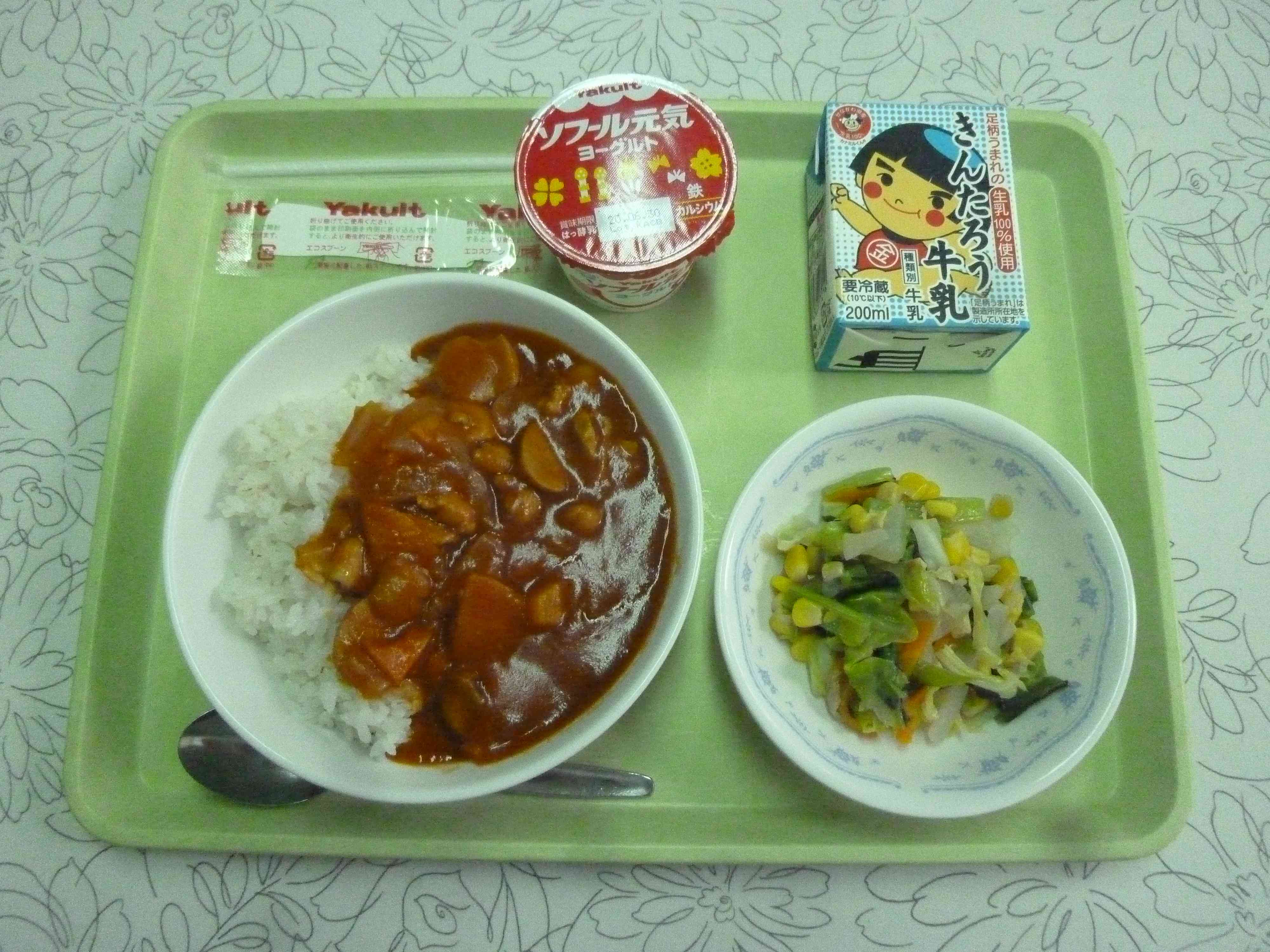 【メニュー】 牛乳 元気ヨーグルト 青菜とコーンのソテー ハヤシライス 【栄養教諭から】 今日から給食が再開となりました。新型コロナウィルス感染症予防のため、配膳は教職員が行い、机も班にはせず前を向いて食べます。まだまだ制限がある中での再開ですが、子どもたちは久しぶりの給食を楽しんでいました。 【子どもの声】 「久しぶりの給食、やっぱりおいしかった。」(4年) 「家のハヤシライスとはちょっと違うけれど、おいしく食べられた。」(6年)【添付ファイル】
