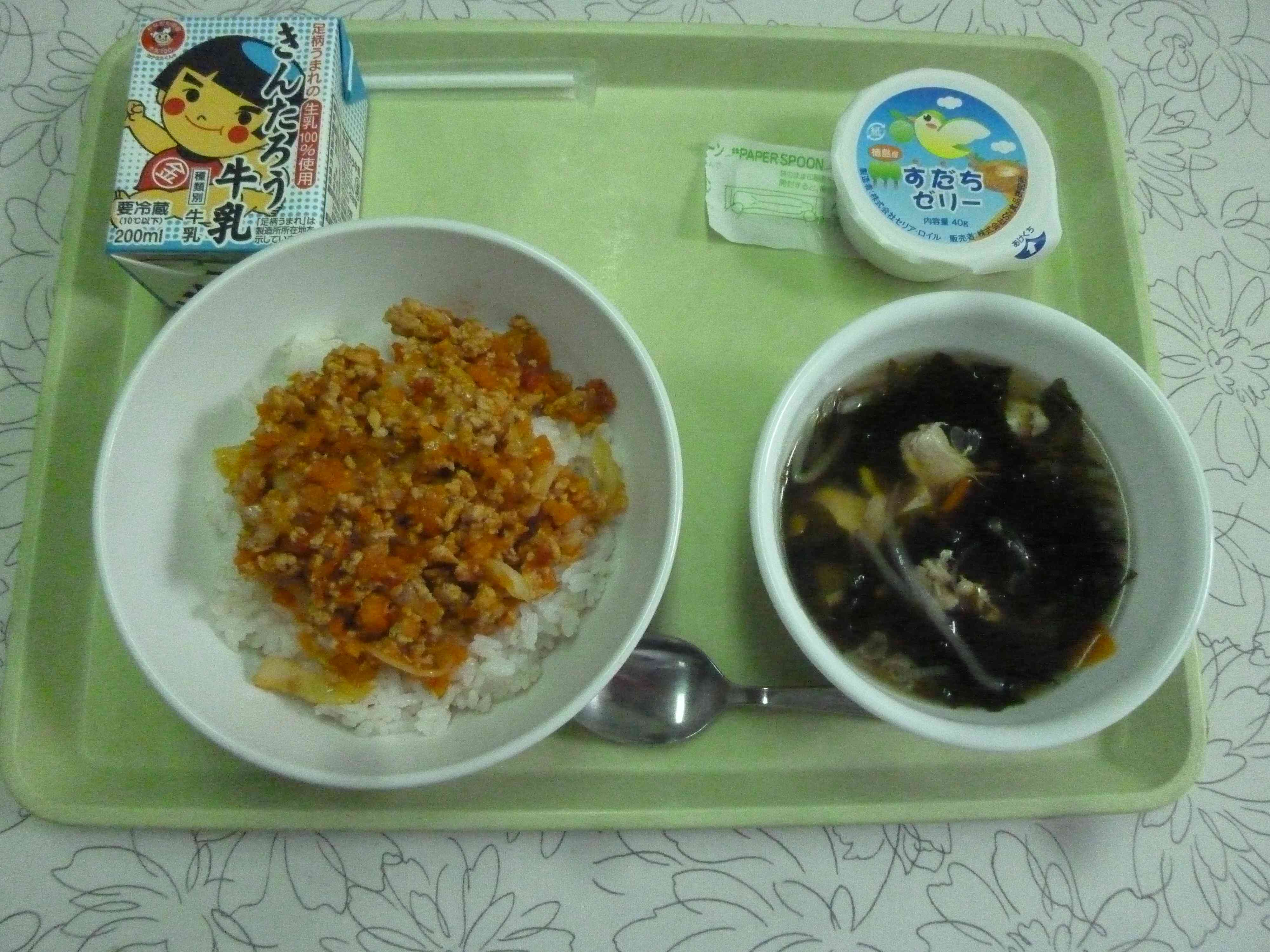 【メニュー】 タコライス 牛乳 わかめスープ すだちゼリー 【栄養教諭から】 今日は沖縄県のソウルフード「タコライス」です。スパイシーなひき肉が、ご飯とよく合います。配食の関係上、今回はキャベツも具の中に混ぜました。湯本小ではおなじみの、ひき肉と一緒に高野豆腐も混ぜ込みました。脂質を抑えて、カルシウムは倍増です。最近では、大豆ミートという大豆のお肉も売っていますね。大豆ミートも高野豆腐もそれぞれの香りが気になる時は、トマト系やカレーなどのスパイスが香る味付けにすると、気にならずに食べられますよ!おすすめです。【添付ファイル】